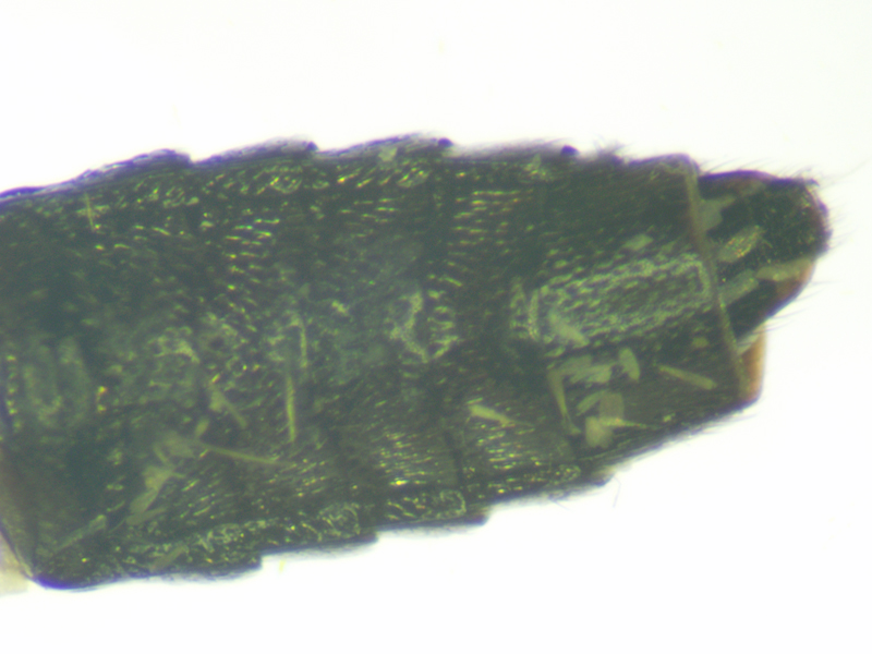 female Stenus aceris showing head & pronotum, antannae & palps, basal abdominal tergites, hind leg and hind tarsi, North Elmham (Norfolk, UK), 23rd March 2022