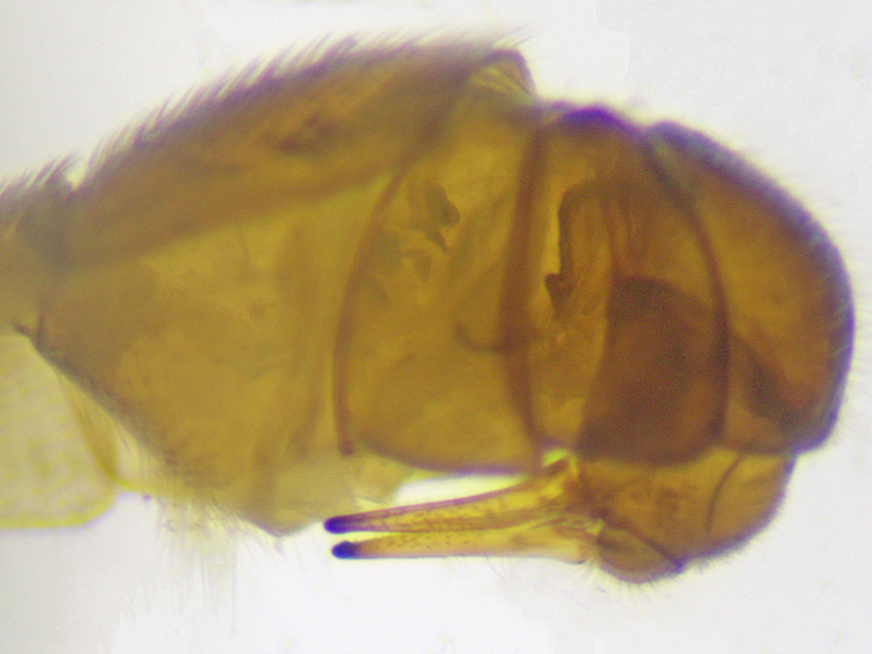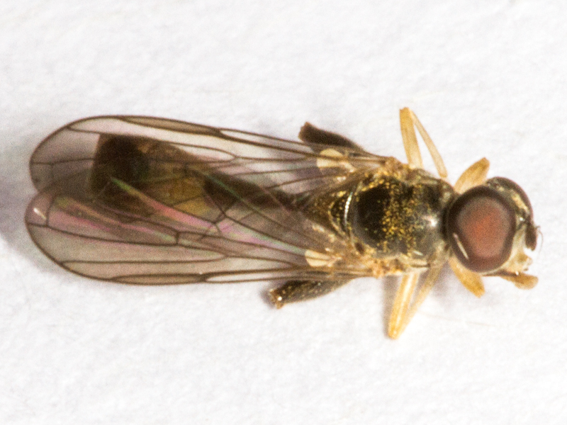 This was swept from Hemp-nettle and Common Nettle. My visit was not primarily for surveying and I forgot I'd collected a few insects when I got home so didn't get round to photographing them until they'd died. I initially assumed this was a female given the separation between the eyes but when I saw the shape of the abdomen tip I realised this must be one of those hoverflies where the males' eyes aren't close together. The specimen was dried out when I examined it and I could not see the processes on the genitalia which, according to Ball & Morris, suggested that it might not be clunipes. However, I was aware that such detail can be hard to see on dried specimens so referred to Stubbs & Falk for more detail. The key there didn't require visiblility of the genitalia (or even sexing it) and it keyed to clunipes reasonably straightforwardly. The only slight hesitation was with the colour of the face as the yellow wasn't very obvious - rather dark (not really whitish-yellow) and partly obscured by the silvery hairs. However it was yellow, and may have darkened after death. Just to make absolutely sure I cleared the abdomen to see the processes. I could see the processes from below but even after clearing they were still not exposed in side view until I prised it open.