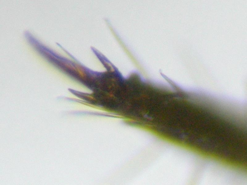 These was keyed using the AIDGAP key by Barber. One was already dead when retrieved from the pitfall trap and the other nearly so, so neither presented themselves well for a photo shoot (but at least they didn't run away). When I examined them both were dry and I couldn't straighten them without breaking them so don't have an accurate measurement of their length: the first was 7.1mm (excluding appendages) in its slightly curled state so I'd guess it was no more than 8mm or so in life. I noted from the BMIG website that there is a second Lamyctes species in the UK now and attempted to eliminate this by counting the antennomeres. That proved harder than I thought (not least because both only had one complete antenna): I'm pretty sure they both had more than 25 antennomeres (the best one seemed to be 26 or 27 depending on whether it had one long but slightly broken apical antennomere or two shorter ones). However, both had two pairs of three forcipular coxosternite teeth which seems to rule out the very unlikely africanus.