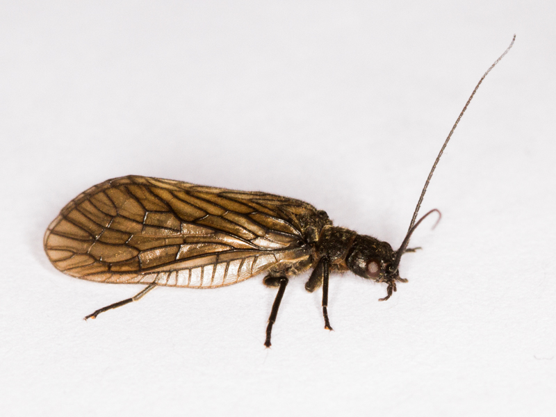 Most of the insects I have found have been males, and these are reasonably easy to identify with a fresh specimen. If it has dried out then it may be necessary to macerate the abdomen, for example in potassium hydroxide solution, before the critical details are visible. Females need a good look at the underside of the abdomen. The only female alderfly I have found so far was in the jaws of a centipede and unfortunately the bit of the abdomen that is required for identification had already been eaten.