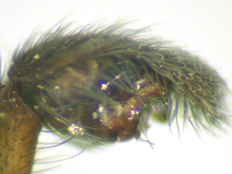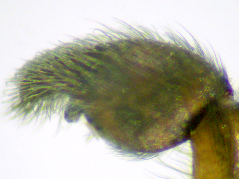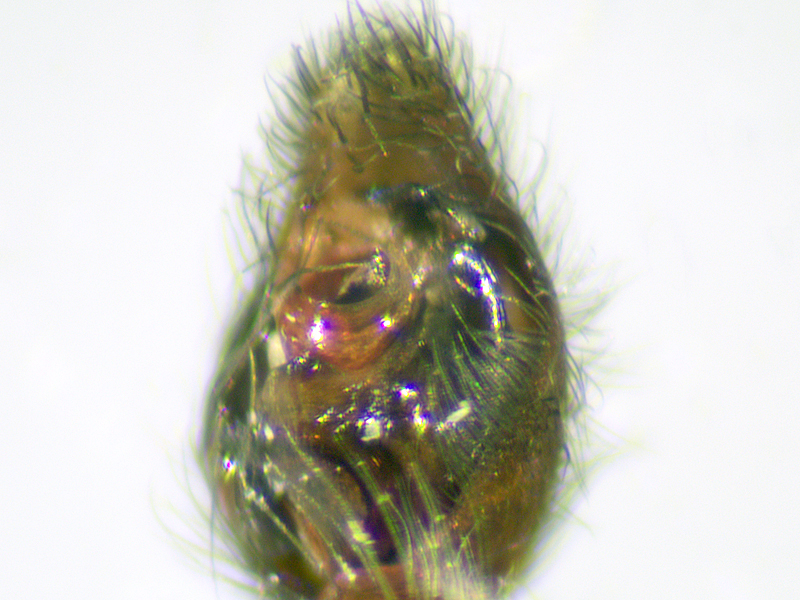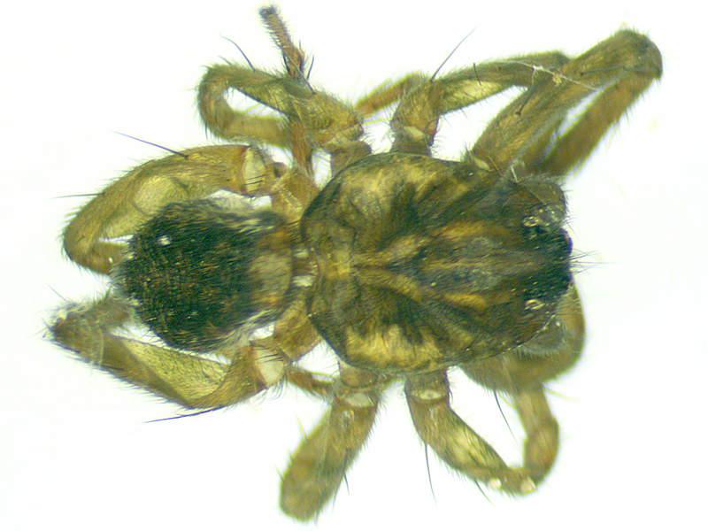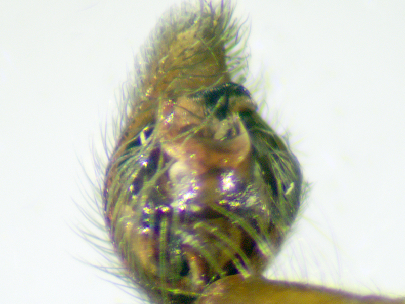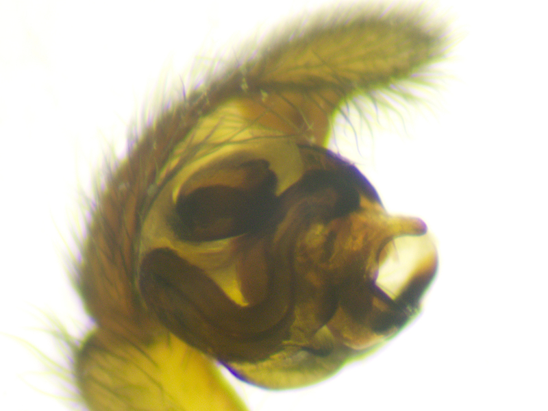 This was found in a pitfall trap and identified primarily from its pedipalps, although the pattern of its carapace was also a helpful pointer (and clearly different from the three species of Pardosa that were in the same set of traps).