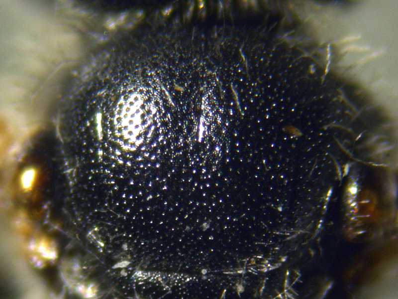 female Lobe-spurred Furrow Bee Lasioglossum pauxillum showing forewing, angulated hind corners of the propodeum, scutum puncturing and microsculpture, tergite with centrally-defined ridge defining the apical depression and inner hind tibia spur, North Elmham (Norfolk, UK), 14th June 2020