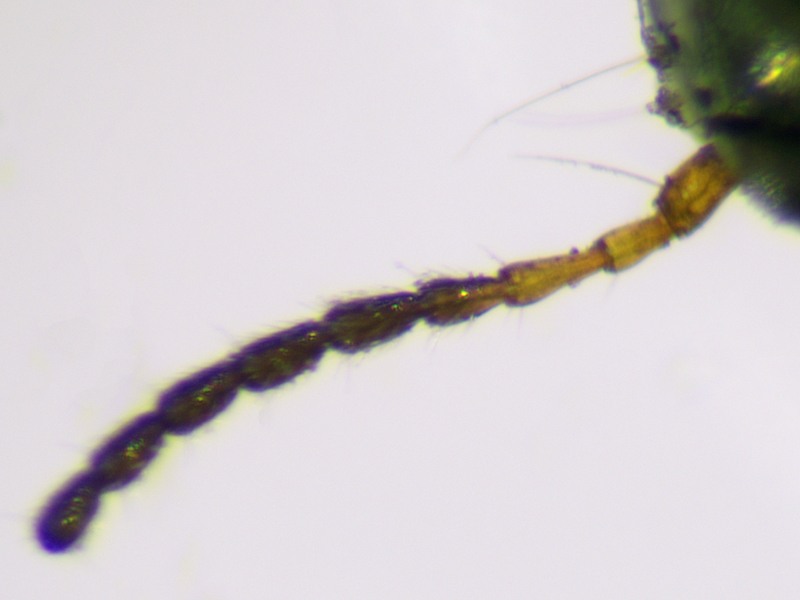 This beetle came to light in my garden. It was just 4.5mm long and hardly over 2.0mm wide, so at the bottom end of the size range for tibialis which is the smallest of all the Amara species in the UK. The elytra were barely metallic at all, but it seems this doesn't disqualify it from being tibialis although it sounds like the species is normally more metallic than this one was. The abbreviated scutellar striae were practically absent, their path marked by two (on one side) or three (on the other side) small punctures.