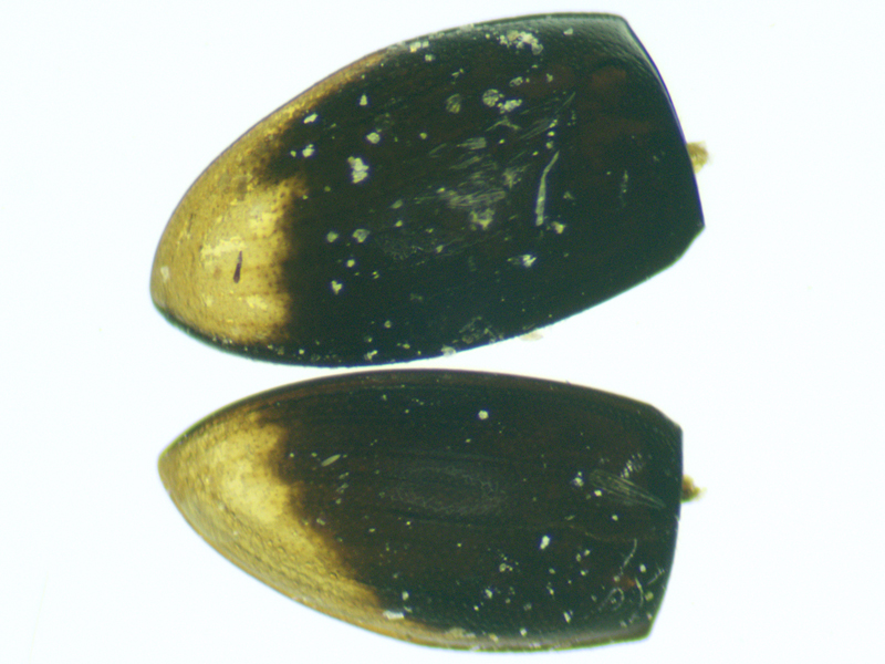 This one keyed to marinus using Duff fairly smoothly. The yellow on the elytra appeared to stop well short of the humeri looking from above but when viewed from the side you could see it extending further forwards. Checking against Hackston I hit a dead-end - the problem seemed to result from this key requiring the front angles (at least) of the pronotum to have a reddish patch whereas on mine the proonotum was completely black. My photo of the hind angles of the pronotum does appear to show a slight reddish reflection at the front margin of the pronotum near the front angle, but even after noticing this in the photo I could not find any angle to hold the beetle at where I could see this under the microscope. My previous example above did have such a reddish spot and so do most examples I can find online, but the extent seems to be variable and as Duff doesn't mention it I'm hoping it can be missing altogether. This beetle was 2.6mm long.