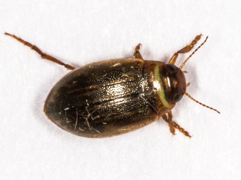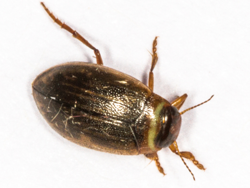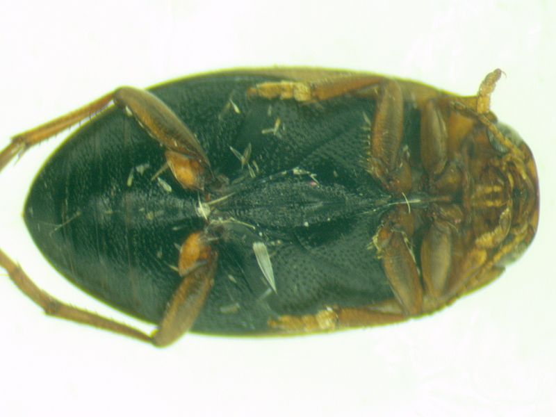 At 4.6mm long, lacking a visible scutellum and clearly having 5 tarsal segments on its fore and mid tarsi, this keyed quite easily to Laccophilus. The size and absence of a stridulatory file on the hind coxae identified it as minutus. Most photos of this species I found online seemed to show paler and more strongly-patterned elytra but these are variable.