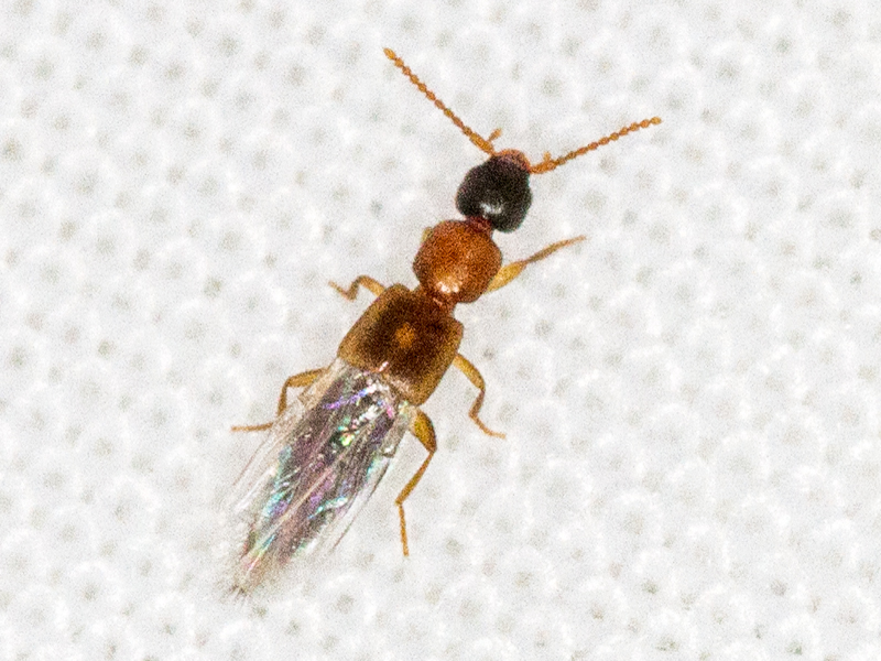 I assume it will get easier with more experience but at the moment I still find the decision as to whether the antennal insertion points are on the upper or side surface of the head the first stumbling block when identifying rove beetles. In this case, with the benefit of hindsight I can see why it was the side, but this was less clear than on another pair of beetles I was examining at the same time, so in some doubt I keyed it both ways. If I took it to be upper then they keyed to subfamily Staphylininae but reached a dead-end when attempting to key it as such. If I took it to be side then they keyed to subfamily Paderinae and then to Lithocharis nigriceps, and as that's a species that does look like my sepcimens so I assume this is correct.