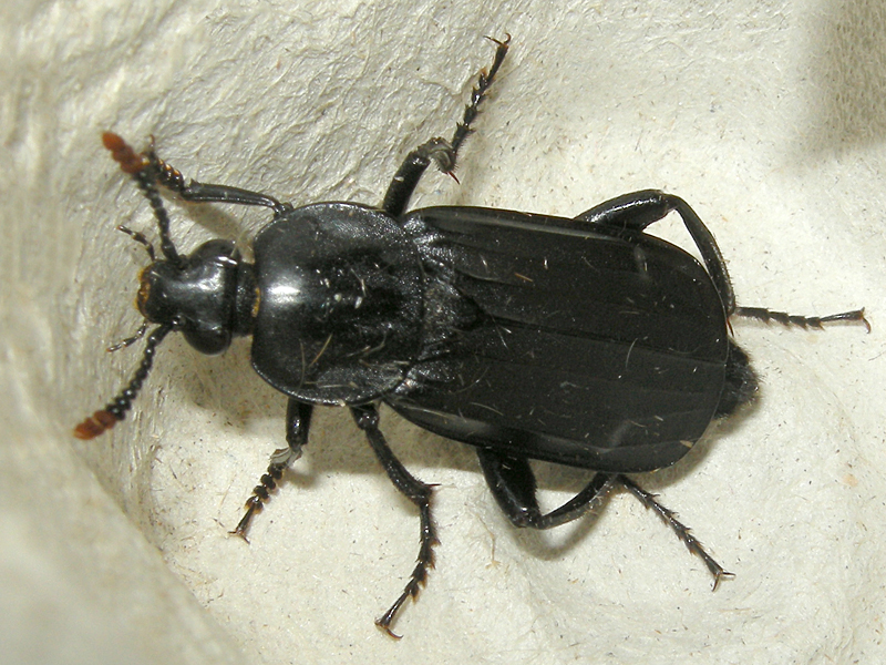 The common name Shore Sexton Beetle is often applied to this species. However, some sources imply that this species is not one of the sexton beetles, presumably restricting that term to the genus Nicrophorus (I'm deducing this from the comment in NatureSpot under Nicrophorus humator where it claims humator is the only all-black [other than orange on the antennae] sexton beetle - as the current species is also all-black other than orange on the antennae I am presuming that the author did not consider it to be a sexton beetle).