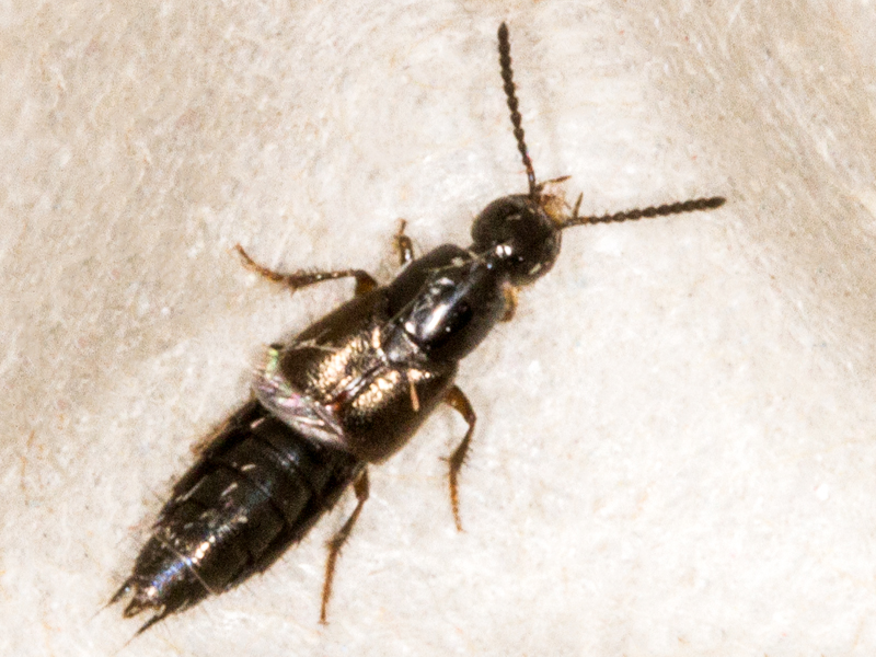 I'd been back through both keys a couple of times but couldn't see where I might have gone wrong (assuming it was my error and not the keys' errors) so decided to keep hold of it until I've got a bit more Philonthus experience under the belt. That wasn't long - the very next beetle I looked at was a Philonthus and initially gave me similar problems, seeming to key to a dead end at umbratilis/sanguinolentus using Duff. That was a very similar beetle in many respects but had a smaller and perhaps shinier pronotum and paler legs - and it keyed to quisquilius using Lott & Anderson. It turned out that it was quisquilius - the eyes were longer than the temples but apparently I'd misjudged the difference between "clearly longer" and "slightly longer". In view of that I revisited the relative eye/temple length of this one to see if that might be where I went wrong here as well. This time the eye was longer than that of the quisquilius (0.43mm vs. 0.35mm) and the temple shorter (0.25mm vs. 0.32mm), so I think I was right this time to judge it as being "clearly longer". So that didn't really help, but it did make me more confident that I hadn't made a mistake in this part of the key.