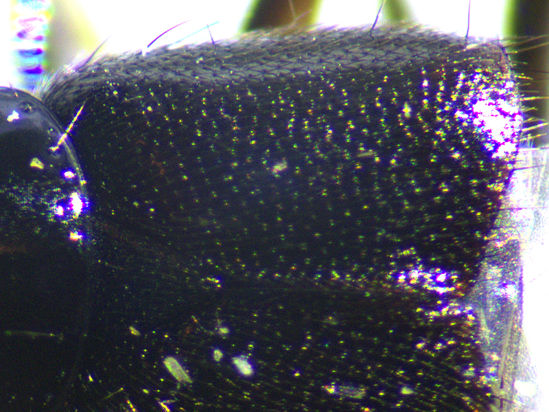 The only other place where I hadn't been very confident was my judgement of the head shape at couplet 3 (Duff). I'd judged it to be transverse, or at least close enough to be one of the "doubtful cases" that the key said was treated both ways. What if I'd been wrong about this? In that case it would key to concinnus, and yes, the description matched almost perfectly. My estimate of size was slightly under the limit given in Duff for concinnus, but when the beetle is dried and folded up it's always tricky to judge size accurately so I'm not overly worried about that. Looking at photos of concinnus online some do sseem to have slightly more elongate heads but some look very close to mine. But to be certain I needed to understand why it hadn't keyed to concinnus using Lott & Anderson either - and there it transpires it was down to the elytra colour. According to Lott & Anderson the elytra should have a faint dark green metallic sheen which I had not been able to detect (and still can't). If I took it as having this then it would have keyed straight to concinnus. But does the absence of green mean it can't be concinnus? Well according to Duff no - he describes concinnus elytra as "black to brownish, sometimes with a very faint metallic dark green lustre". So I think my inability to detect green on the elytra does not exclude concinnus, and all things considered this is left as the only feasible identification.