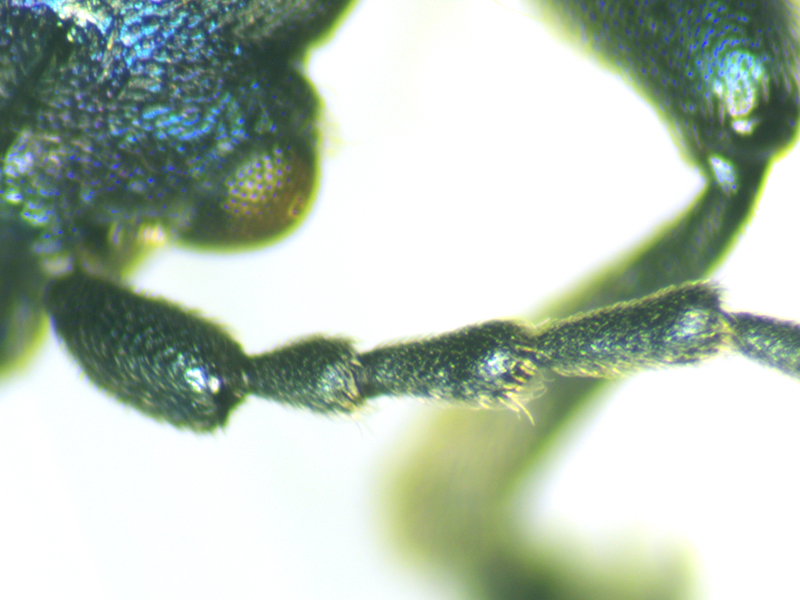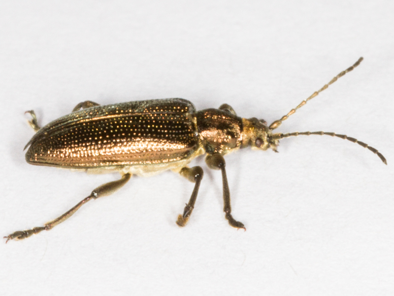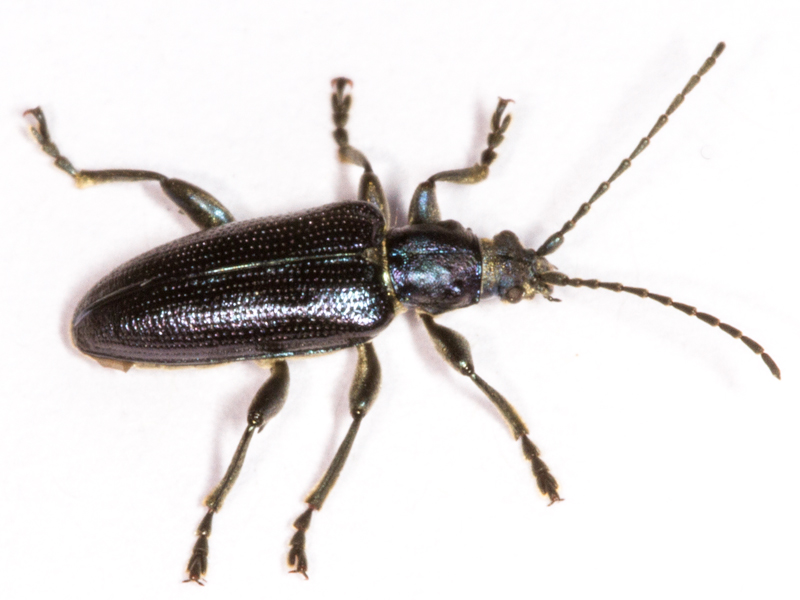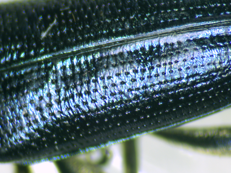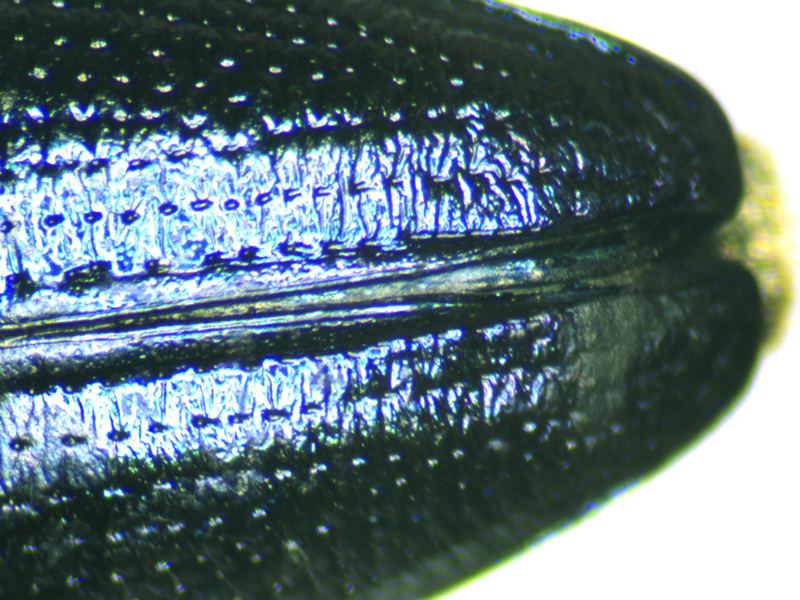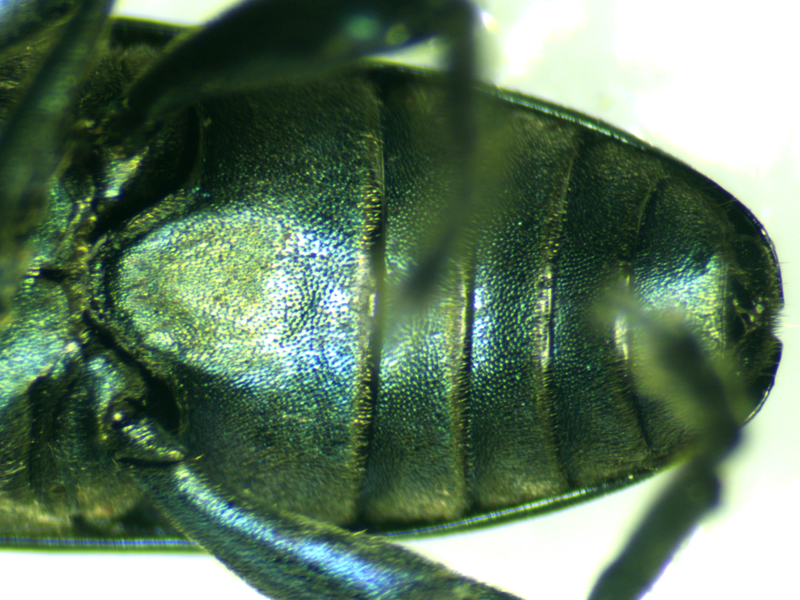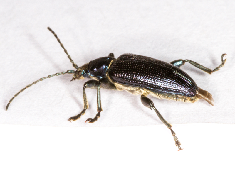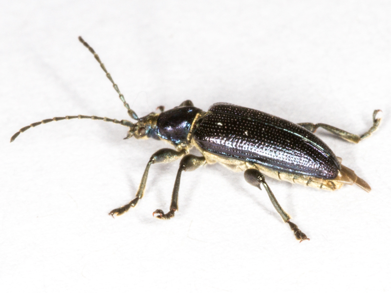 The next two were found on or around Yellow Flag Iris (there were two of the dark blue types but I only retained one). I attempted to key them before realising that the plant was a significant clue, and without being certain whether or not they were both the same species. They both keyed easily to Plateumaris discolor/sericea using Duff but telling these apart was a bit trickier. There seemed to be some minor differences in the pronotum sculpture between the two individuals and also the relative lengths of the first four antennal segments, both important characters for telling the two apart, but neither seemed to match discolor well - though at first I wasn't convinced they matched sericea perfectly either. Hackston added a difference in the colour of the hairs on the underparts. The golden hairs on the blue beetle stood out, whereas on the golden-brown beetle they were harder to see as they blended in against the very similar background colour, but although the overall appearance was different because of the different background colours, the actual colour of the hairs was the exactly the same.