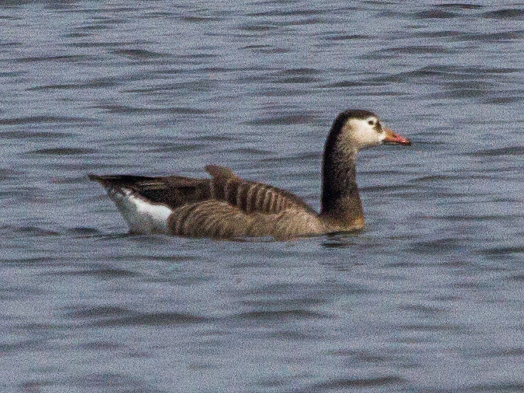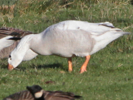 Excess white in the plumage is theoretically possible in a hybrid involving a non-domestic Greylag as such leucism can occur naturally, however it shifts the balance of probability overwhelmingly in favour of it involving a bird with domestic heritage. The extensive white behind the cheek and the white band on the body therefore pointed to the Greylag parent having some domestic ancestry, but the fact that it was in a flock of fat white domestic geese makes this all the more certain in this case.
