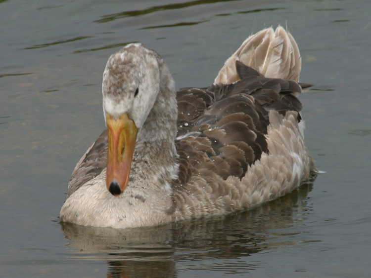 Next to consider the goose parent. We don't have a lot to go on here, but the yellowy-orange tones on the bill base (and also around the nostril) and the orangey legs indicate one of the grey geese of the genus Anser, most likely one with a orangey-coloured bill, such as Greylag Goose. Blue Snow Goose might also be considered, especially in the light of the contrastingly dark primaries, but I am not sure why a hybrid between a red-and-black-billed bird and a pink-billed bird would produce a partly orangey-coloured bill, and if it were Mute Swan x blue Snow Goose I would expect clean white edges to the longer wing feathers. The fact that the nail is not entirely black may indicate that the goose parent was a pale-nailed species, such as Greylag Goose.