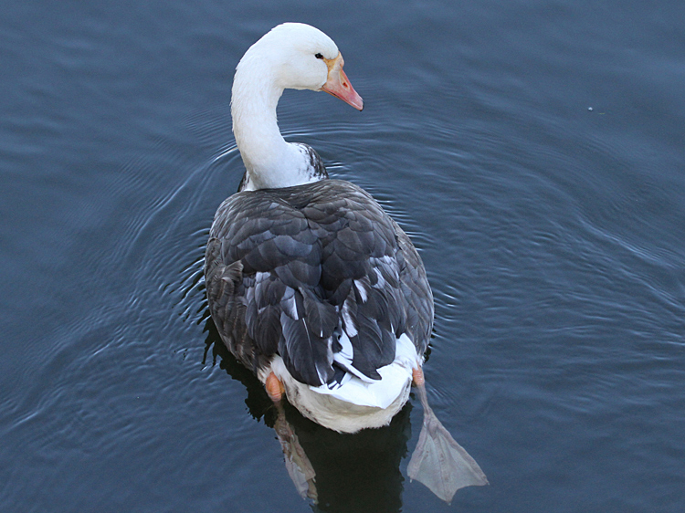 So we have to look at swan x goose hybrid ("swoose") as the likely identification. The predominantly pinkish-red bill, the mainly black nail and cutting edge, the raised knob, the curved neck and the white head and neck would all be compatible with Mute Swan. It could be argued that the black nail and cutting edge, the knob and the white plumage could all come from the goose parent if that goose was domestic Swan Goose, and that the red bill and curved neck could come from Black Swan instead. There is a sharp demarcation between the pinky red bill and the yellowy-orange base of the bill in the same place as Mute Swan shows demarcation between the red and the black, and this probably lends supports Mute Swan as the likely swan parent. Also the shape of the neck appears to be a more precise match to Mute Swan than Black Swan. So far it looks like Mute Swan x goose sp., with Black Swan x domestic Swan Goose perhaps not being entirely ruled out.