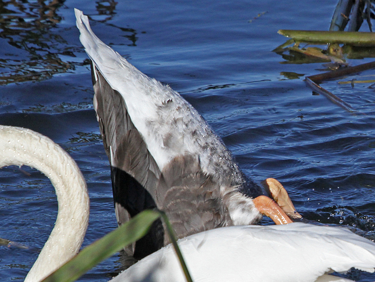 A couple of things are worth mentioning as they might lead some observers to question whether Mute Swan x Greylag Goose is a possibility. Firstly the dusky vent might not be expected from a Mute Swan x Anser sp. as both have white vents - however, it is now well established that dusky markings on the vent is a typical and common feature of hybrids between Anser geese and Branta geese where neither parent show such dusky markings, so this may not preclude a swan x Anser hybrid either. Secondly the tone of the dark plumage is rather dark grey, not brown except on the fringes of some feathers, especially on the flanks. Intuitively we might expect a Mute Swan x e.g. Greylag Goose to be much browner than this, however presumed hybrids between grey geese (including Greylag and Pink-footed Geese) and white geese (Snow and Ross's Geese) show similar grey-toned plumage so this might not be preclusive either. Also some Anser x Branta hybrids appear darker than either parent so we should not necessarily expect a Mute Swan x Greylag Goose to show plumage the same colour as, or paler than, Greylag Goose.
