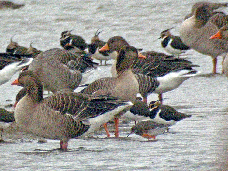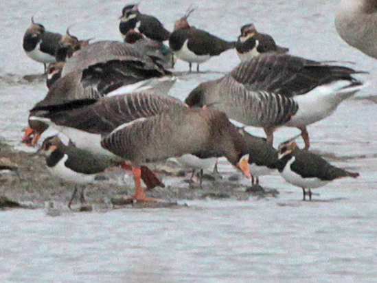 Greylag Goose x Greater White-fronted Goose hybrid (with Greylag Geese and Lapwings), Stiffkey Fen (Norfolk, UK), 24th November 2013