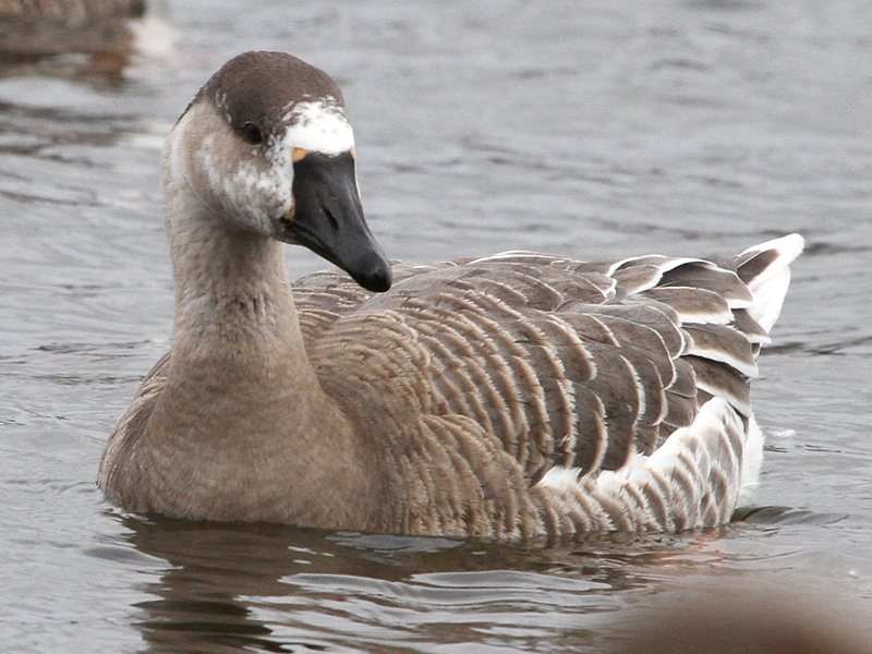 I struggled with the ID of this bird for some time. The dark 'mane' and the all black bill were indications of Swan Goose ancestry but the other parent was less clear. The white-edged greater-coverts suggested Snow Goose or Ross's Goose but it was a while before I became comfortable with idea that this bird could be a domestic Swan Goose x Snow Goose hybrid, and only after much helpful input from others. Had I noticed that the greater coverts were long and hanging, perhaps I would have reached this conclusion earlier!