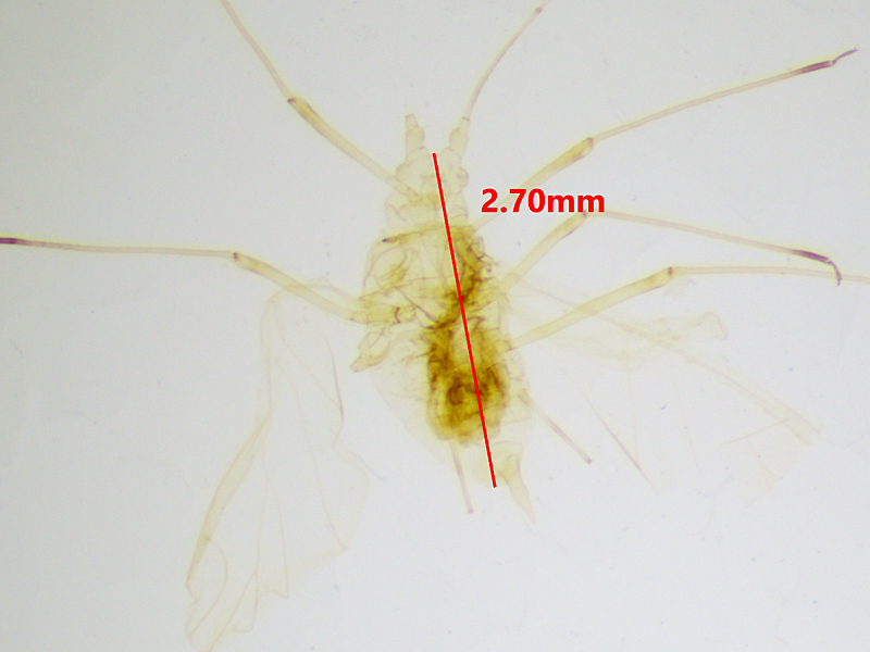 Pea Aphid Acyrthosiphon pisum showing rostrum RIV+V (with measurement and from both sides), cauda (without and with measurement), siphunculus (with measurement), antennae segment IV (with measurement of base) and body (with measurement), Wendling Beck Environment Project (Norfolk, UK), 9th June 2025