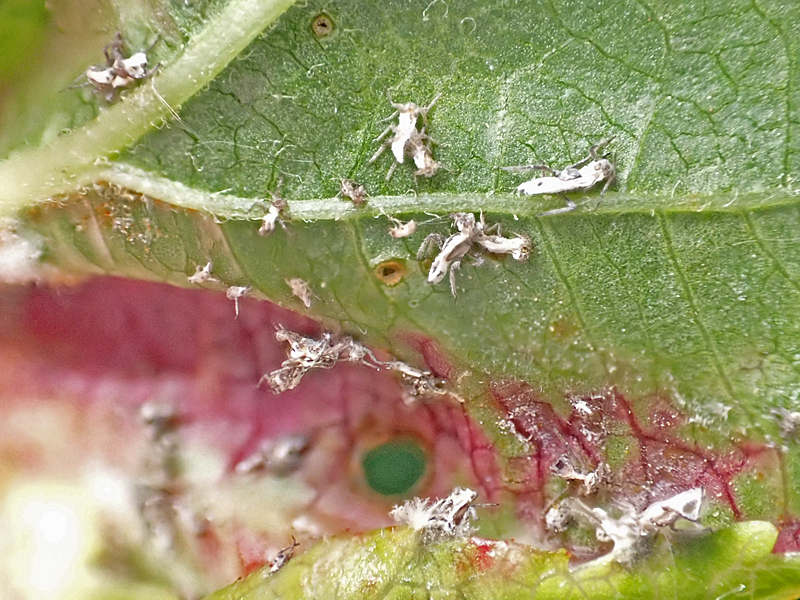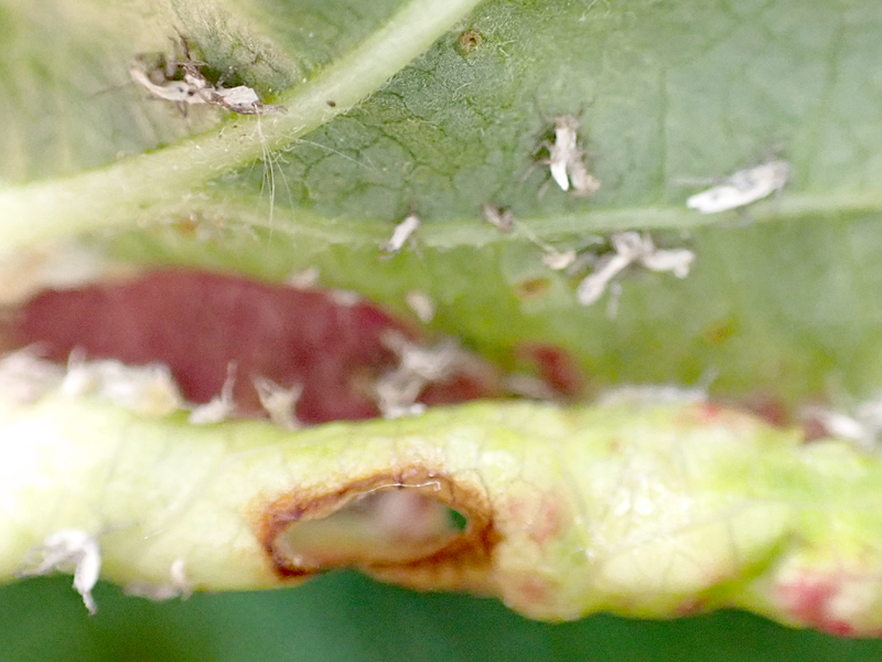 This gall reminded me of the galls of Dysaphis crataegi agg. on Hawthorn, but it was on apple (I'm not certain of the species of apple, but I've found a moth flying round it that's only supposed to be on Crab Apple). I unfurled it to see if I could find any aphids (or anything else) and according to my notes it contained aphids. I must admit though that I can't see any live aphids in any of my photos, only ex-aphids (what I take to exoskeletons of moulted aphids though I'm not sure if there might also be dead aphids among them).