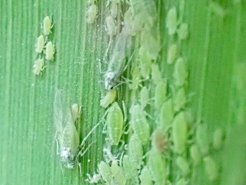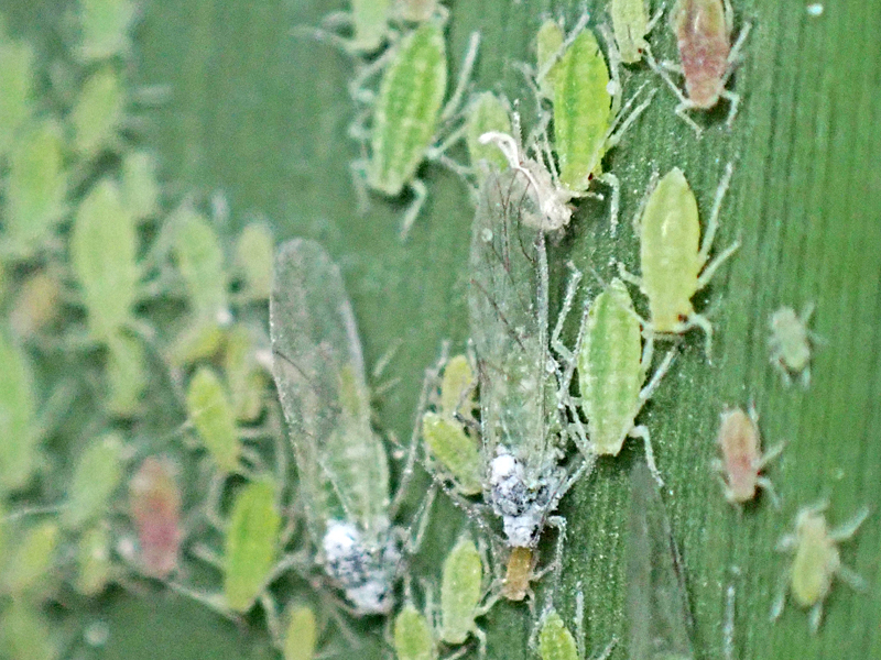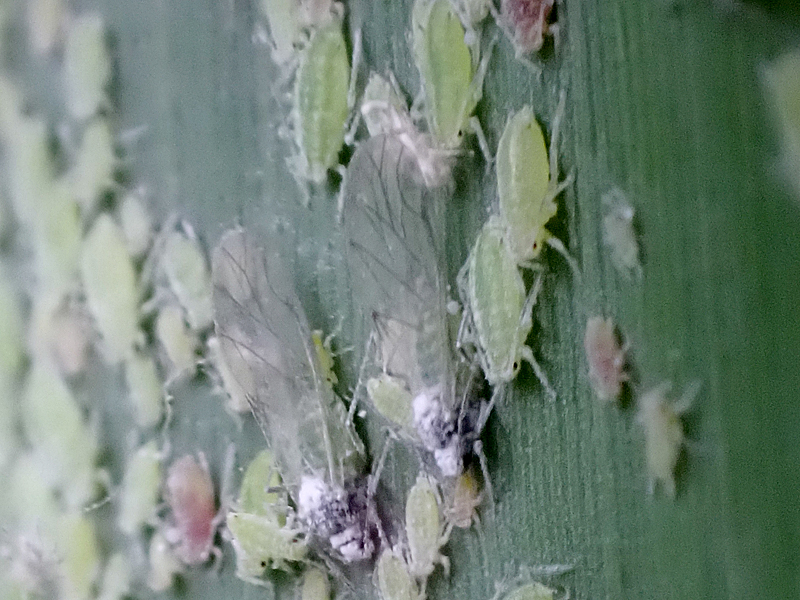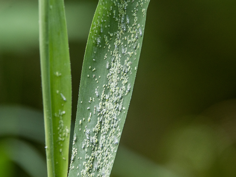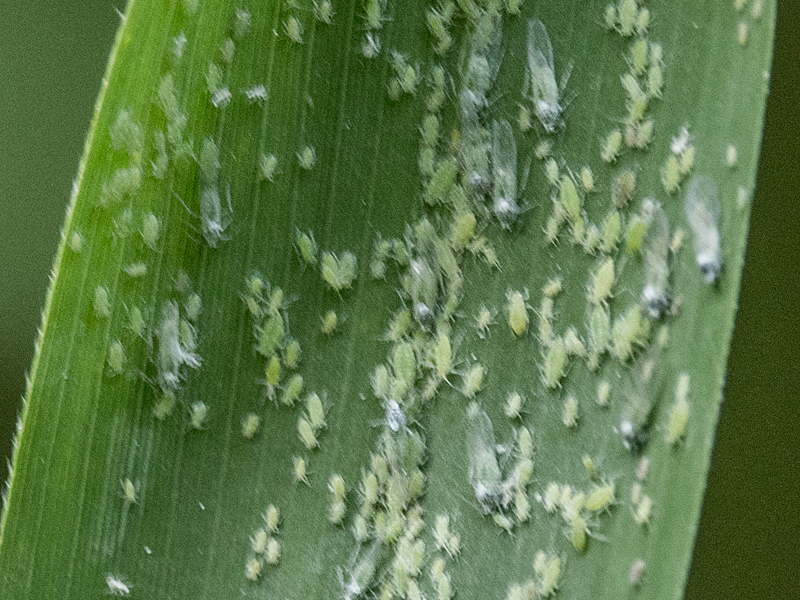 According to the Influential Points website winged alatae start to develop on the primary host, Plum, in early June with the peak migration of alatae to the secondary host, Reed, taking place between early July and early August. I don't know how long it is then before nymphs appear, but given the number and range in size of nymphs on this Reed leaf, and the date in early June, it seems to me that the alatae must have developed and migrated quite early.