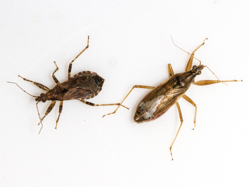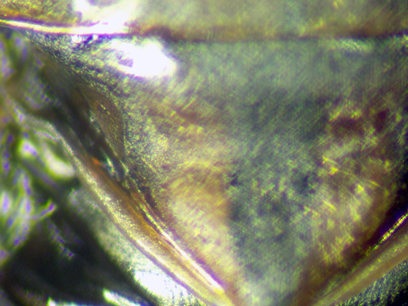 female Broad Damsel Bug Nabis flavomarginatus (with Ant Damsel Bug Himacerus mirmicoides to its left in fourth photo) showing scutellum (with close-up of corner) and top of abdomen, Wendling Beck Environment Project (Norfolk, UK), 25th August 2025