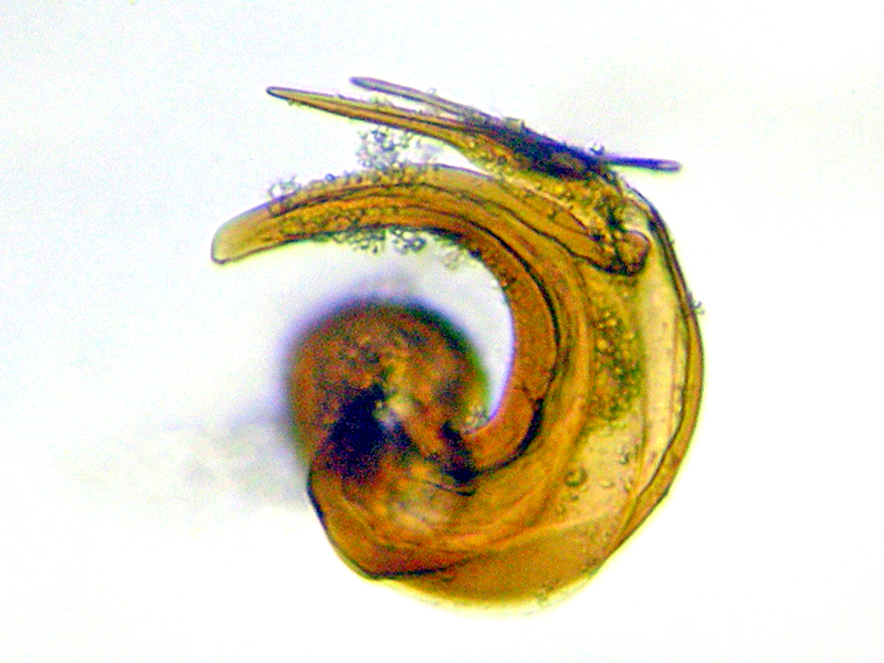 This male was swept from Yarrow (though other plants were also present) and its identification was confirmed by the double flagellum on the paramere. Most species of Orius were eliminated by the long hairs in each corner of the pronotum but this feature is shared by Orius niger. The mid tibia are supposed to be darker on niger, but on this specimen they could hardly be described as pale brown (as described for laevigatus, in contrast to dark brown or black for niger). Orius niger can be much darker overall, but more importantly males have a single flagellum on the paramere.