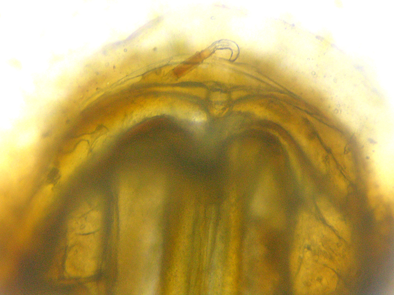 This one was found by suction. The sclerotised section of copulatory tube is short but under high magnification an additional length of unsclerotised tube can also be seen. It's not entirely clear to me whether I'm meant to be judging the full length of this tube including the unsclerotised section or just the more obvious dark section. If the former then it certainly seems short enough to be vicinus rather than majusculus, but if the latter then I'm less clear that it can't be majusculus. The insect was small, at the bottom end of the size range given for vicinus, and majusculus is normally larger than vicinus. On balance therefore I'm tentatively settling on vicinus. I've not found majusculus yet, so may need to review this when I get more experience of both species.
