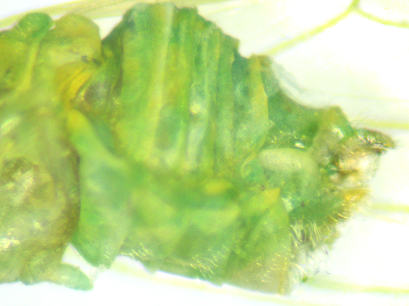 female Psyllopsis fraxinicola showing metatibial spines and terminalia, Wendling Beck Environment Project (Norfolk, UK), 18th July 2025