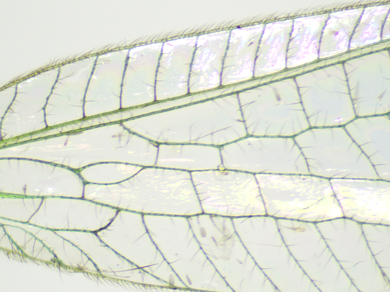 male Chrysoperla carnea showing forewing and tip of abdomen (in life and after clearing), North Elmham (Norfolk, UK), 15th March 2022
