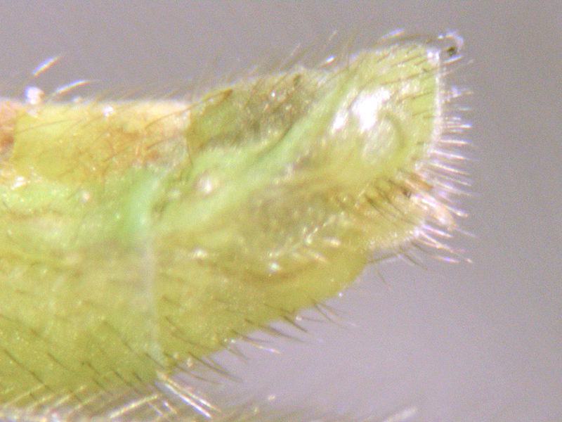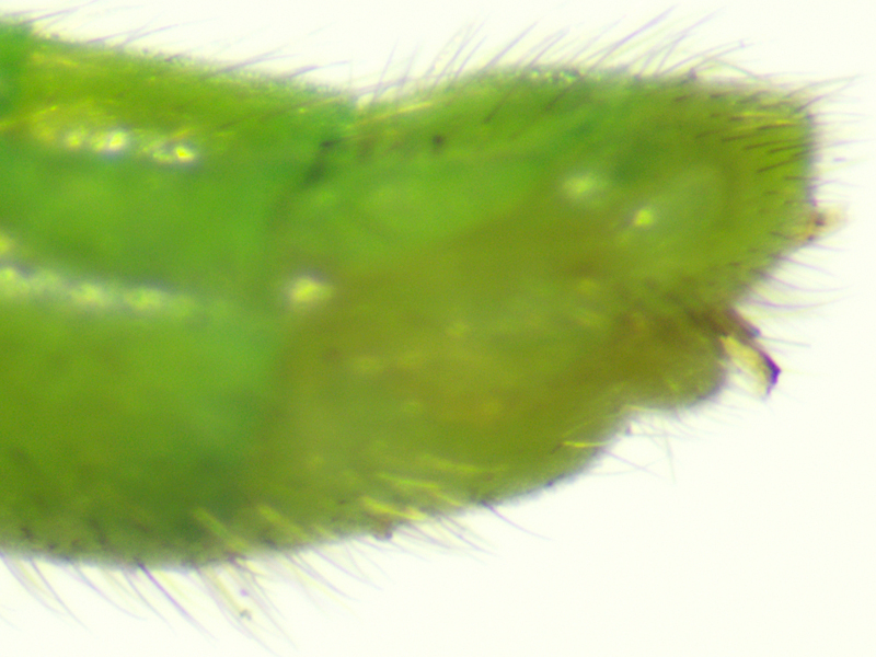 Here on the close up of the tip of the abdomen you can see the relatively large lip compared to the chin. Also note the long hairs on the lip.