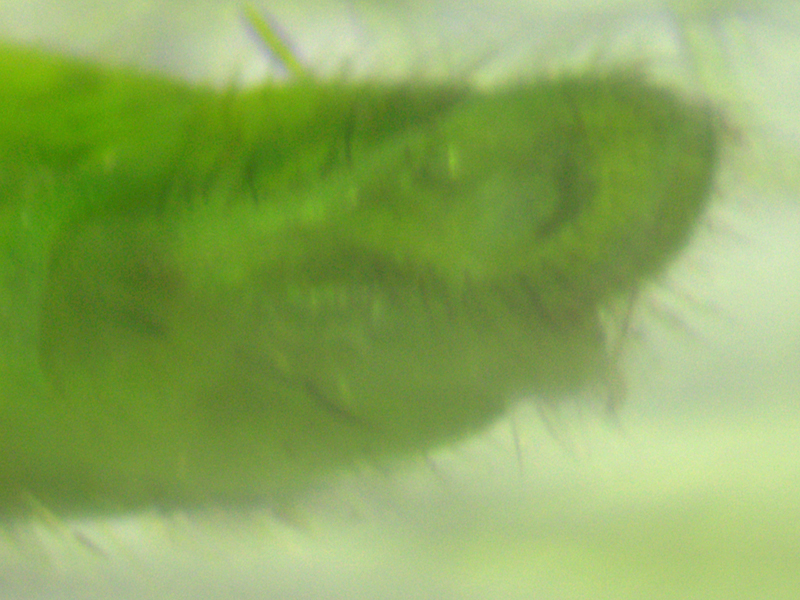 One female I caught laid eggs in the pot. Lacewing eggs (at least some species - not sure if this is true for all or not) are laid individually on long stalks as can be seen here (I couldn't get both the egg and the base of the stalk in focus at the same time, and my Photoshop skills aren't up to merging the images). The eggs started off green but turned white.