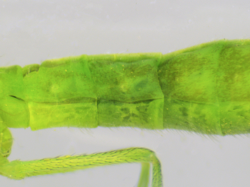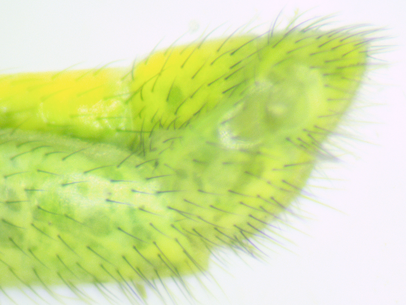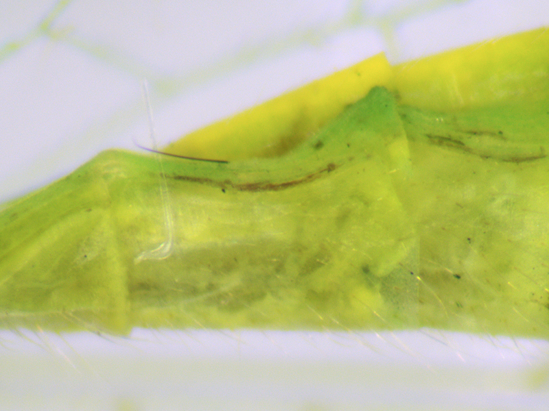 Note that to accurately judge the shape of the wing you need to ensure the wing is flat. I now remove the forewings and flatten them under a microscope slide weighed down on either side. Even then I have often found it very difficult to judge the wing shape on Chrysoperla with some individuals being intermediate or at least not clearly one shape or the other. However on the basis of Plant I identified a small number of individuals with more clearly pointed wings as lucasina, even though the membrane between the tergites and sternites was wholly green. It wasn't until 2025 that I managed to locate the paper that separated lucasina on the basis of song types, and discovered that the research behind this paper found that every single male in their sample that sung like lucasina (and if I understand it correctly also the females that responded to lucasina song) had a dark membrane (at least on segment 2), which suggests that it is at best very unusual for lucasina to have a wholly green membrane. Other earlier authors had found wing shape and the length of costal hairs to be unreliable. This casts significant doubt on my previous identifications - and indeed any identification of lucasina lacking a dark membrane between at least some of the basal abdominal segments. I am therefore currently treating any record of lucasina (including my own) as unproven or at best provisional if it did not have a dark membrane (or if this is not recorded) with the possible exception of individuals that have clear evidence of both unambiguously pointed wings and comfortably short (measured) costal hairs (and ideally also mostly pale abdominal hairs, although this seems to be even more variable).