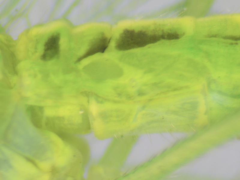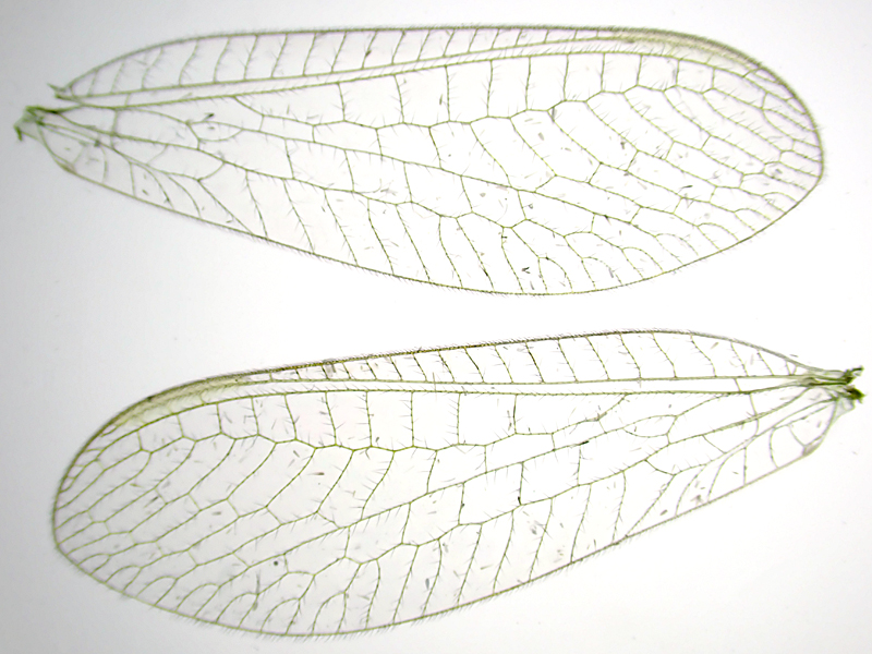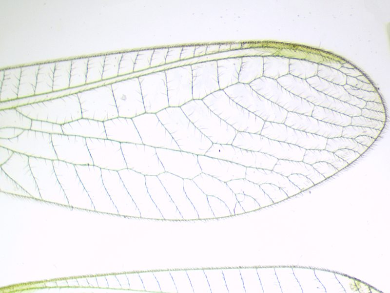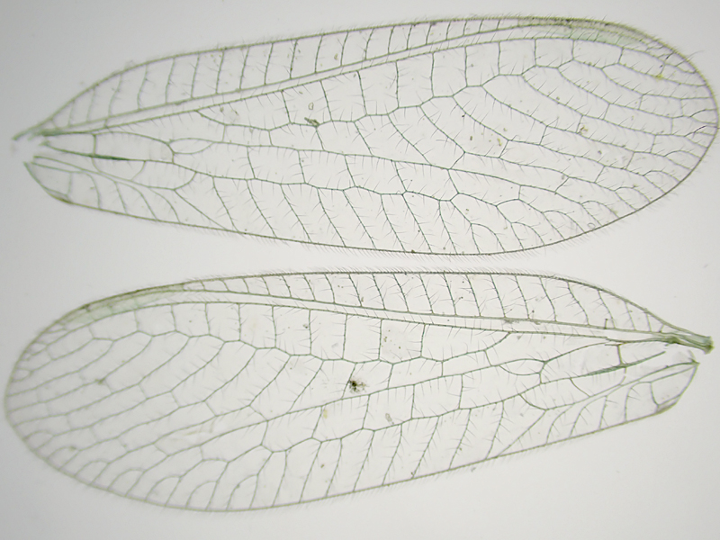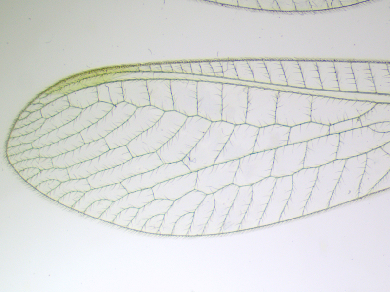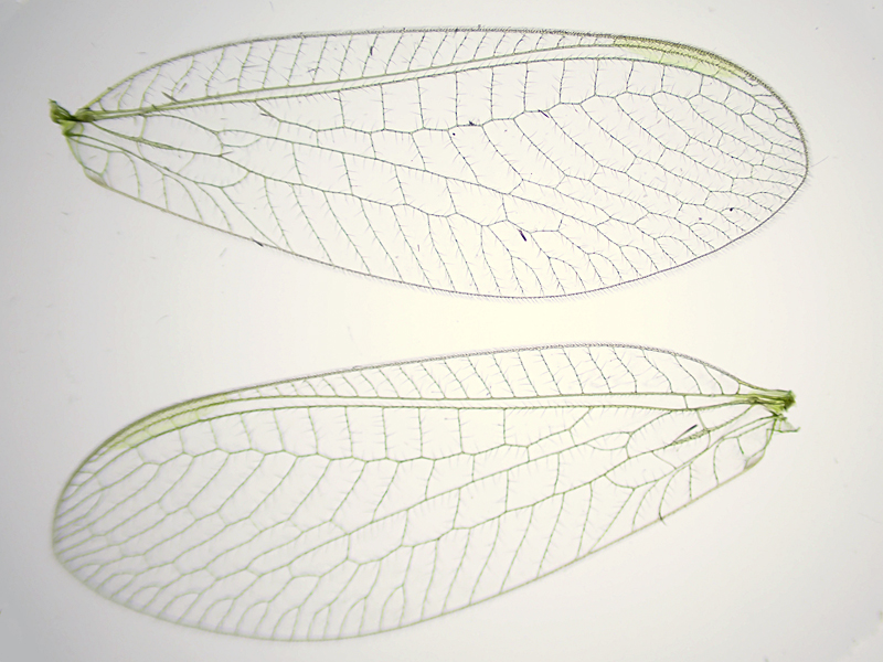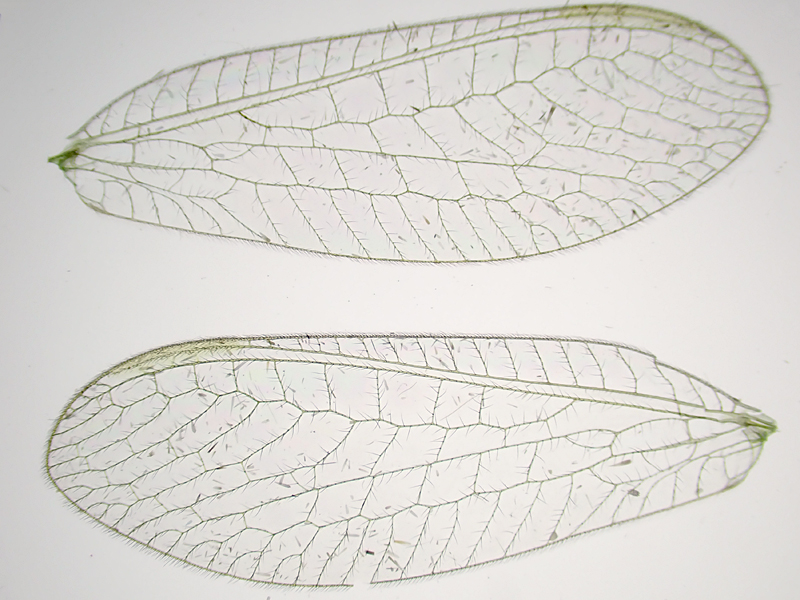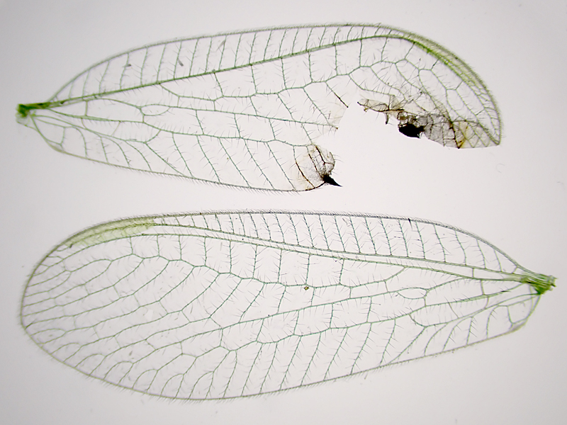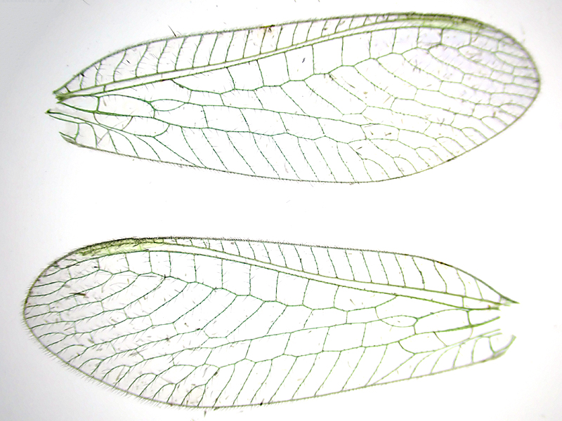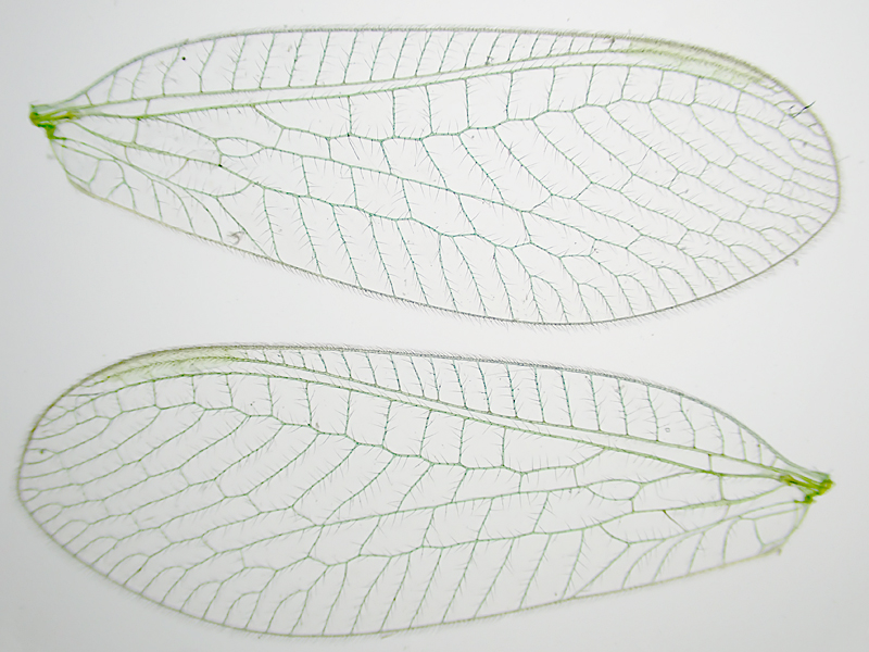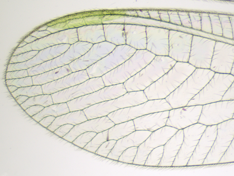 This individual was identified at the time (2023) as lucasina based on the wing shape, after spending quite a lot of time comparing it to wings of lacewings identified as carnea. I thought that the identification was supported by the length of the costal hairs, shorter than the carnea I had examined by that point, although I had only recently begun to measure these so the sample was small. However it did not have any dark on the membrane between the sternites and tergites and I am no longer convinced that my original identification was correct.