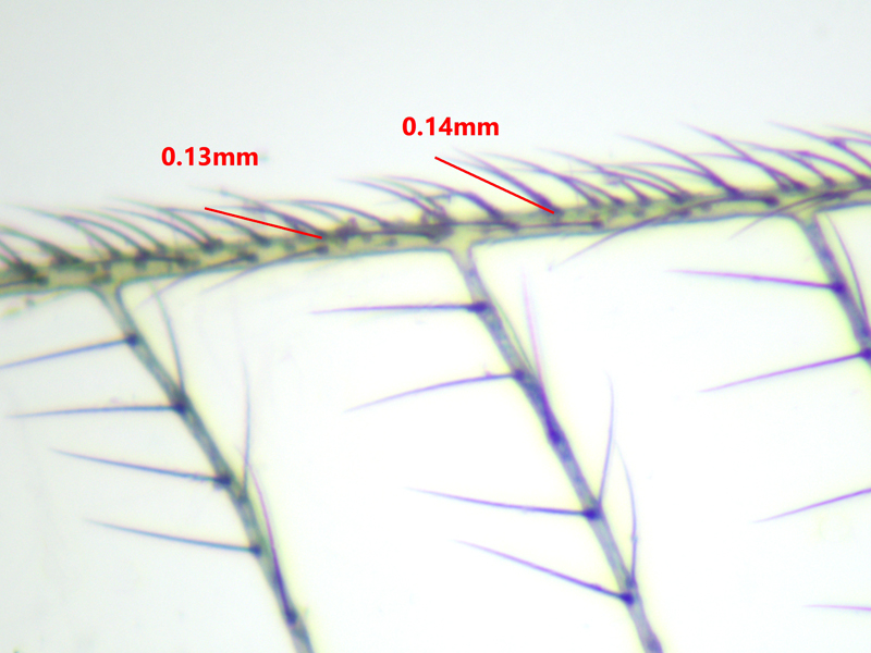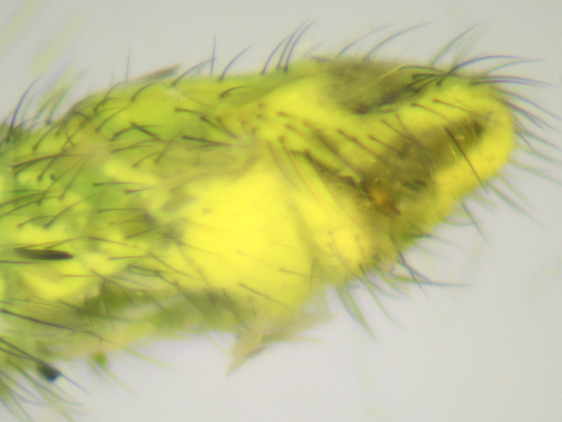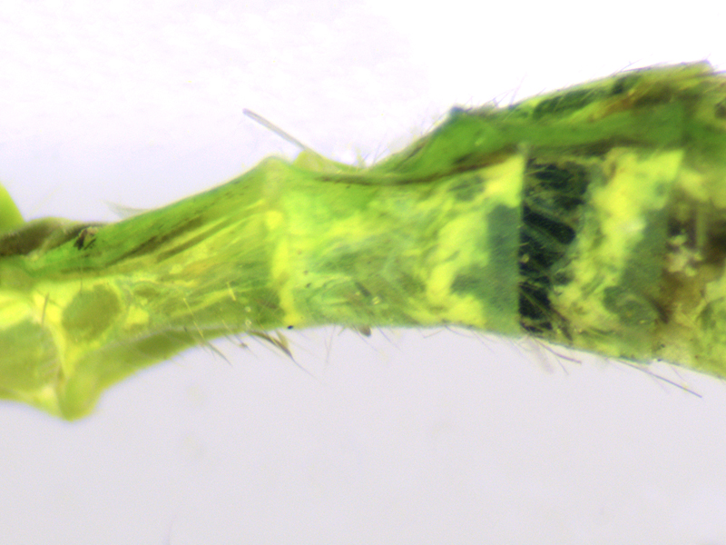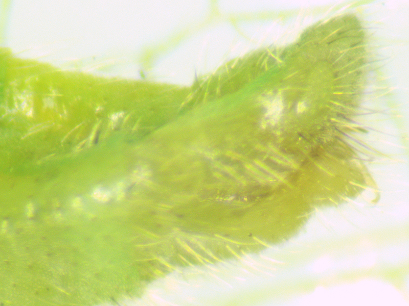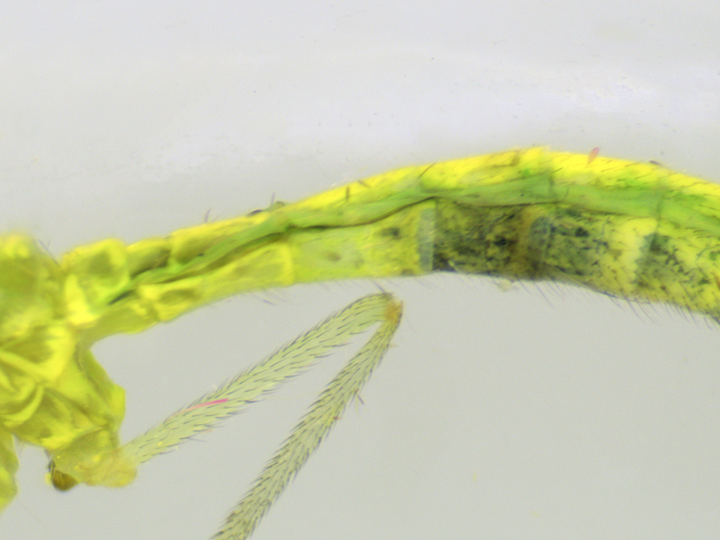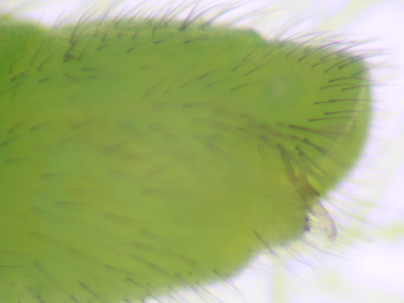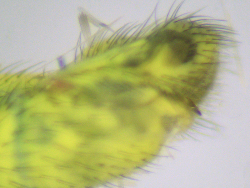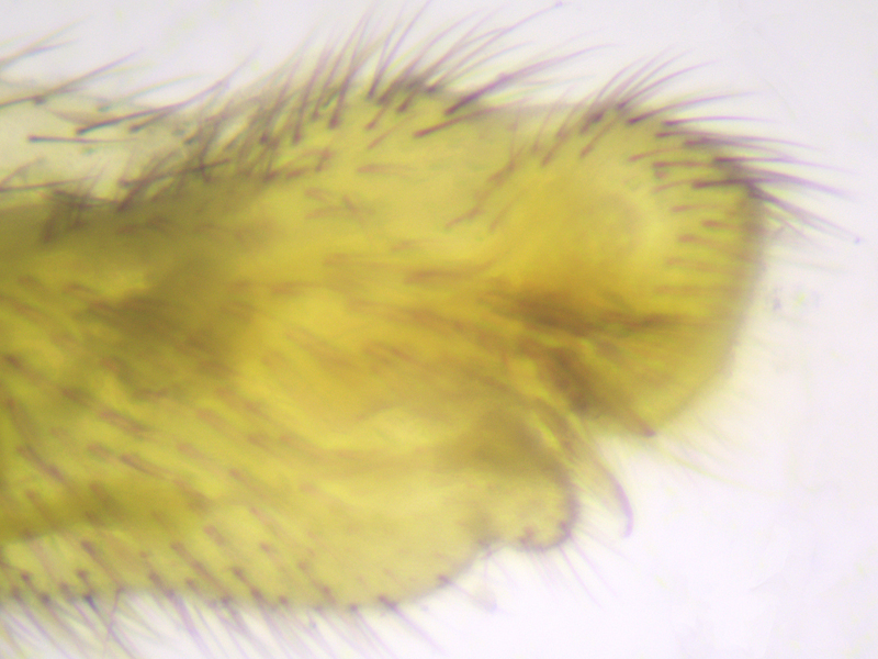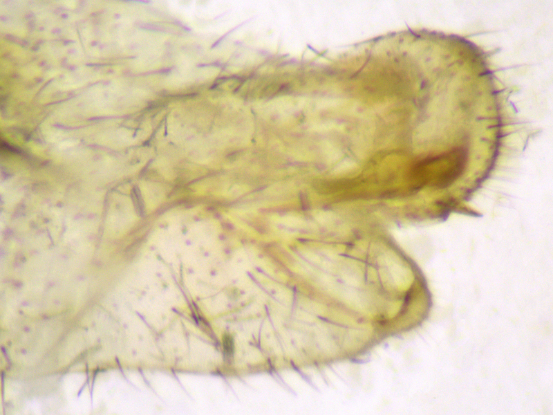 There weren't many costal hairs left to measure on this tatty individual! The membrane between the tergites and sternites isn't easy to photograph in normal side view or elevated view, but here I managed to capture it by photographing it in a glass pot looking up from a low angle. The wing shape was not clearcut to me and the few costal hairs I could find to meausre were a bit longer than the last two and probably within range for either species.
