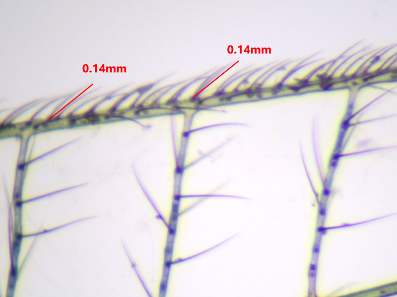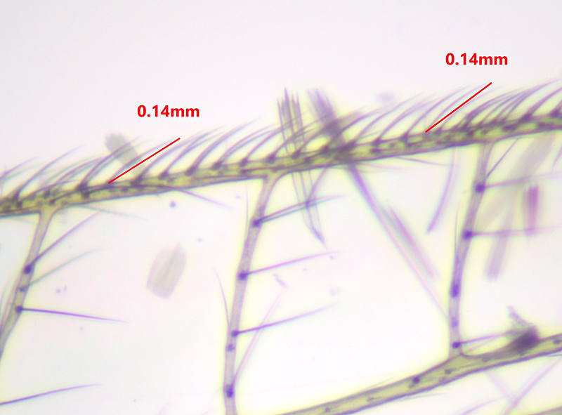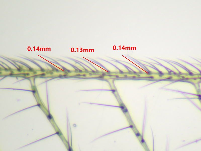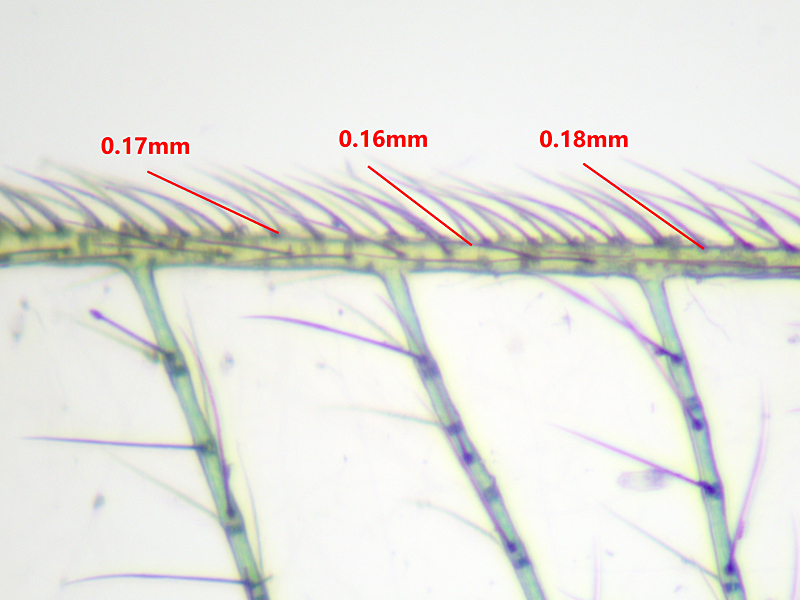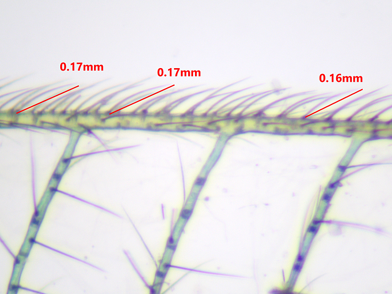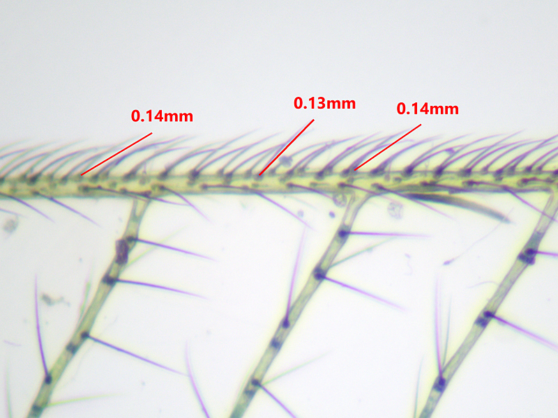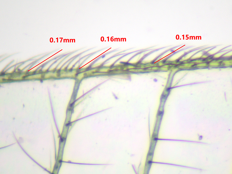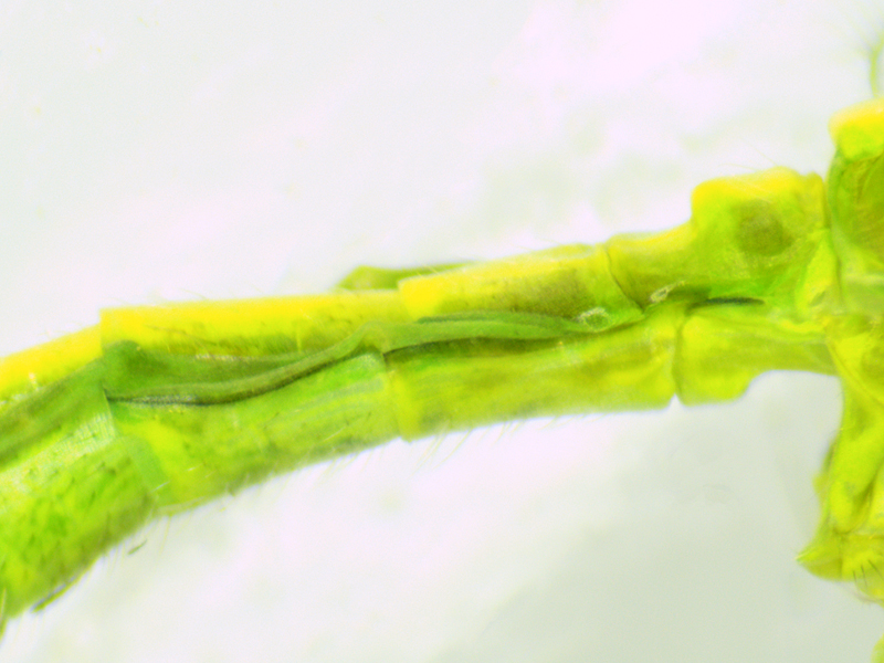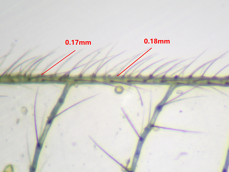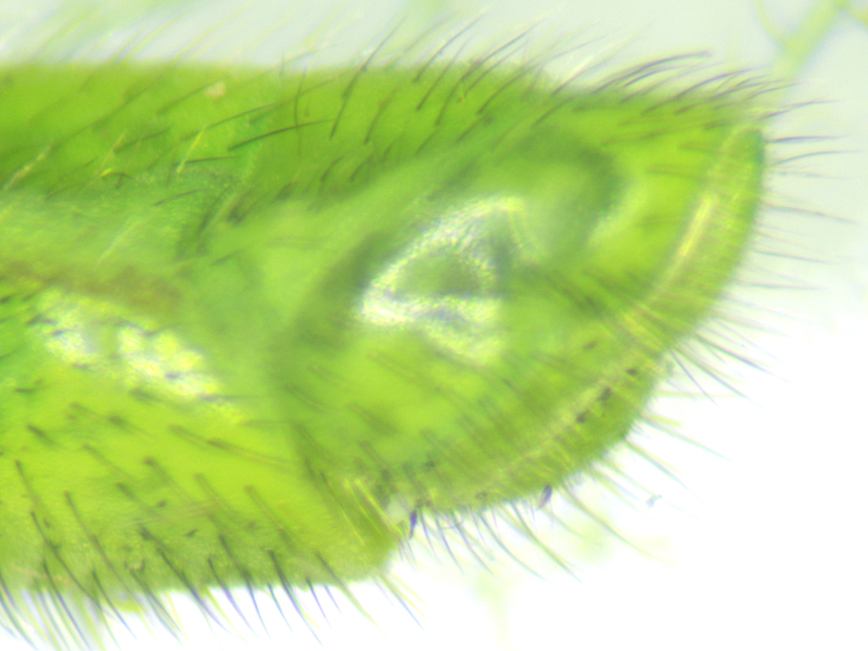 There weren't many costal hairs left to measure on this tatty individual! The membrane between the tergites and sternites isn't easy to photograph in normal side view or elevated view, but here I managed to capture it by photographing it in a glass pot looking up from a low angle. The wing shape was not clearcut to me and the few costal hairs I could find to meausre were a bit longer than the last two and probably within range for either species.