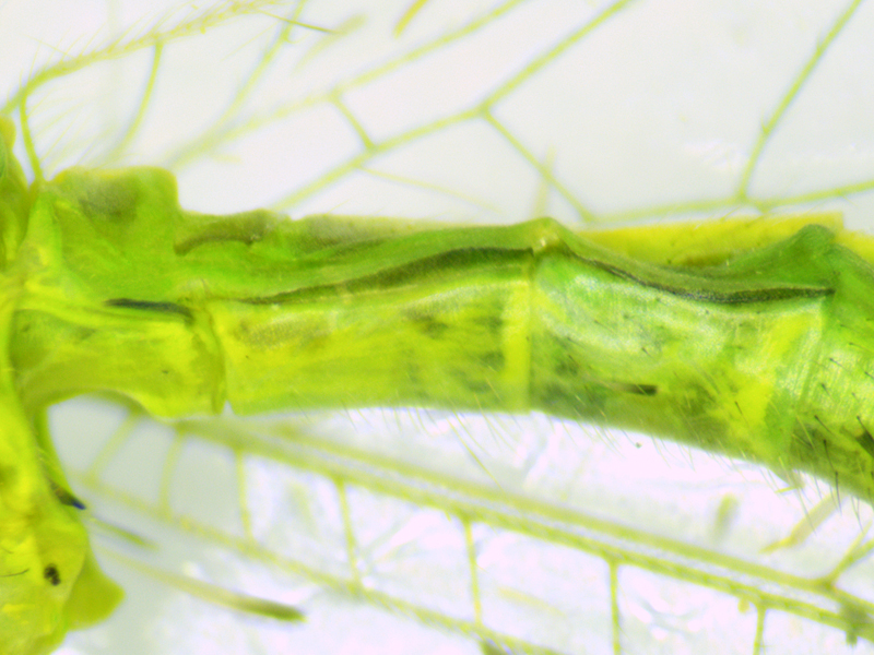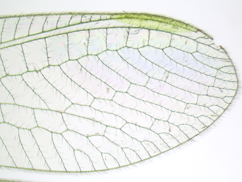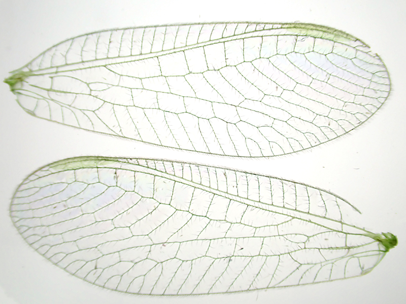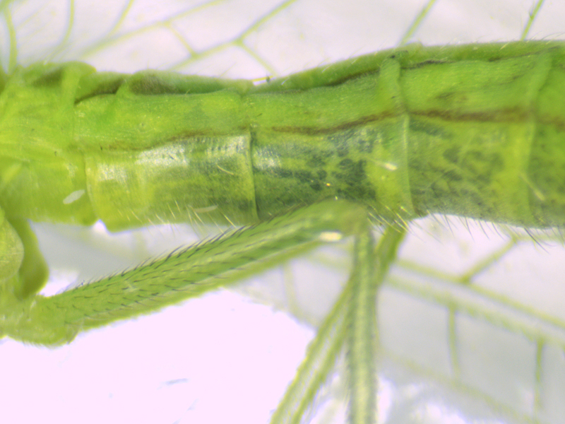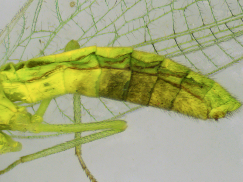 female Chrysoperla lucasina showing abdominal membrane, tip of abdomen, forewings and costal hair length, North Elmham (Norfolk, UK), 18th August 2025
