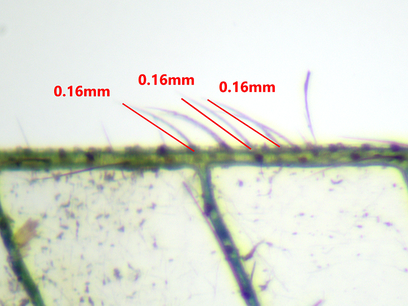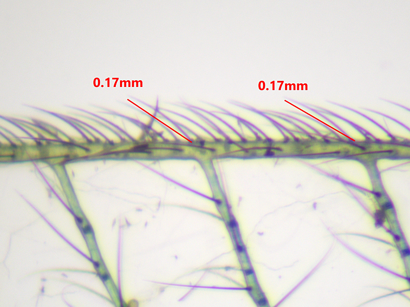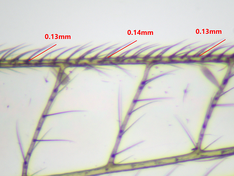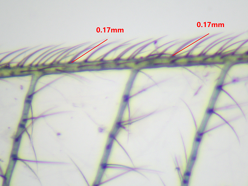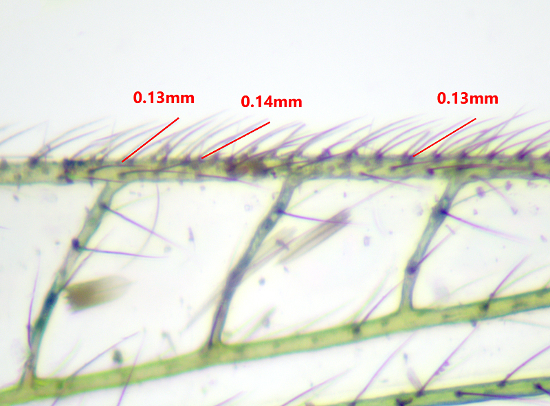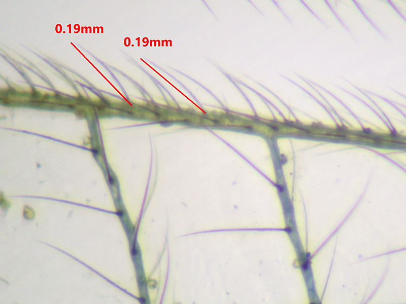 Note that I've been measuring the costal hairs by measuring the actual length of individual hairs at around the middle of the costa. Some references that refer to the length of costal hairs do not provide an actual length or range of lengths for each species, nor any indication of how they might be measured, simply stating that they're shorter on lucasina and longer on carnea. Henry, Brooks, Johnson & Duelli (1996) does provide a figure but I think this must be a mistake - it says, "the setae on the costal margin of the fore-wing were usually short (<1.0 mm)." No matter how you measure them I cannot conceive that they could ever be anything like as long as 1.0 mm on any species of Chrysoperla - the longest I've measured on Chrysoperla carnea is only a little over 0.2mm. One earlier reference that I've only recently found does detail how they measured the costal hairs, and it's quite different from how I've measured them. They're actually not measuring the hairs at all, but the width of the fringe of hairs (which differs from the length of individual hairs because the hairs are slanting). They measure the width of the fringe perpendicular to the costal vein opposite the second costal cross-vein. It may be that subsequent authors have used the same approach in which case any figures quoted would not match my own measurements (but this certainly doesn't explain the anomalous figure of 1.0mm given in Henry et al.). On this one, like the one above, the length of the hairs (the way I measure them) was shorter than most carnea.
