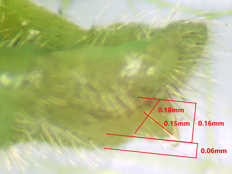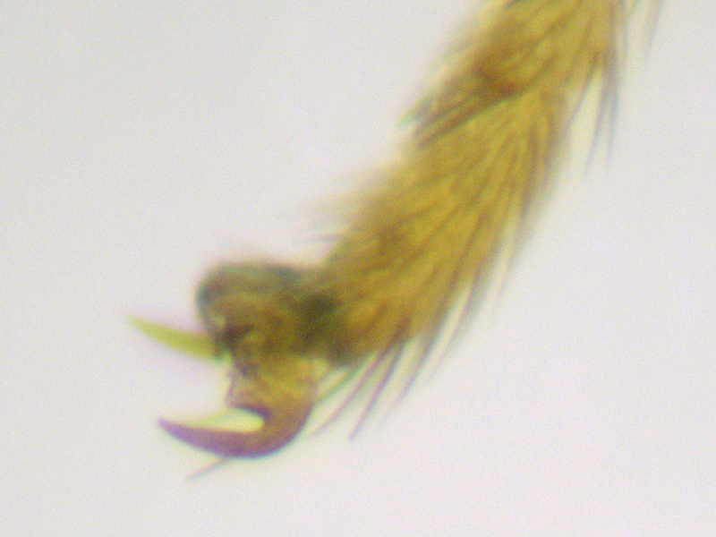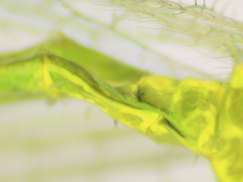 An individual like this prompts me to wonder whether or not the presence of a brown line through the abdominal membrane really is diagnostic. I'm working on the assumption that it is as none of the most recent references suggest otherwise, but this one had quite rounded wings with longer costal hairs than is normal for lucasina and comfortably within range for carnea. If it is correct that the presence of the dark line is diagnostic, and if some lucasina don't have the dark line (as implied by Plant), then surely a lucasina with wings like this and no dark line in the membrane would be misidentified as carnea. I have included an annotated image of the abdomen tip showing measurements as they're used in the paper describing Chrysoperla pallida, though I think it's quite tricky to interpret these precisely as things don't necessarily line up at quite the same angles as shown there. I've also included a photo of the hind tarsal claw as the shape of this is also potentially useful, however I cannot make sense of the descriptions of how this is assessed in a way that applies here.