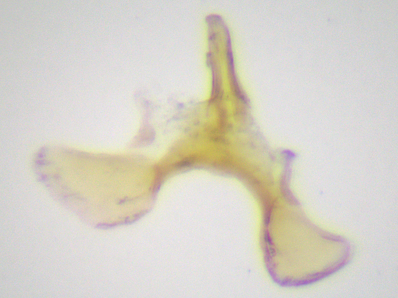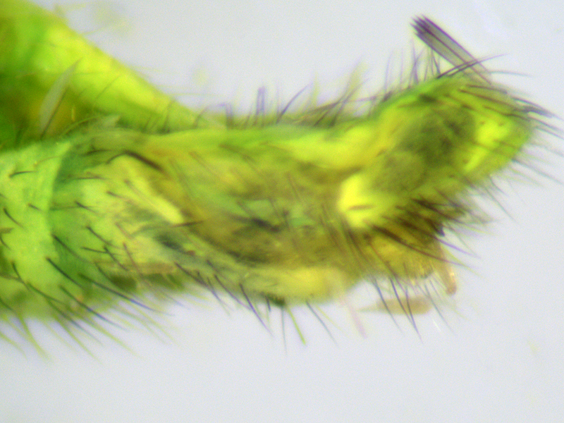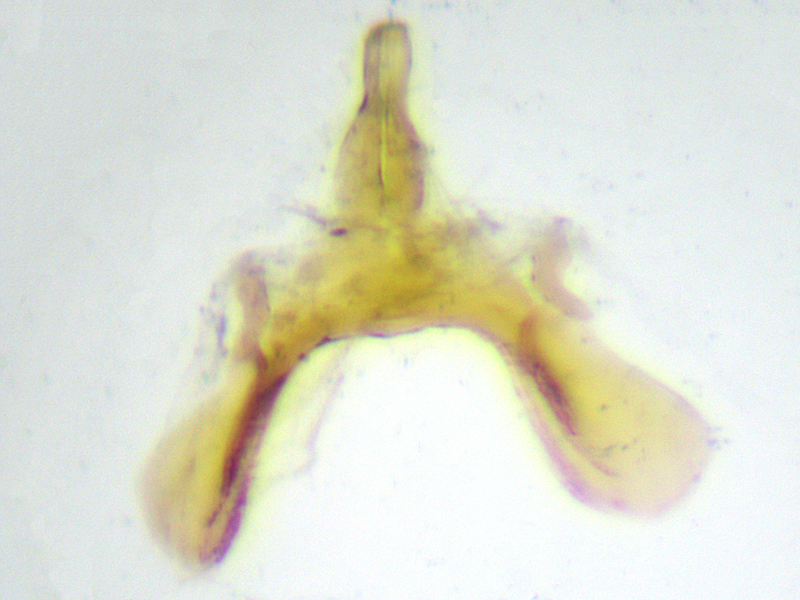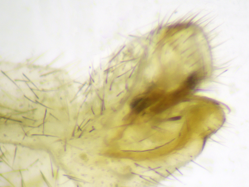 There don't seem to be any consistent differences in the genitalia between this species and carnea, though there have been some claims to the contrary in the past. It is difficult to assess things like the relative length of the tip compared to the width as they're angled slightly and don't tend to sit flat even when prepared on a microscope slide with a cover slip firmly pressed down over it.