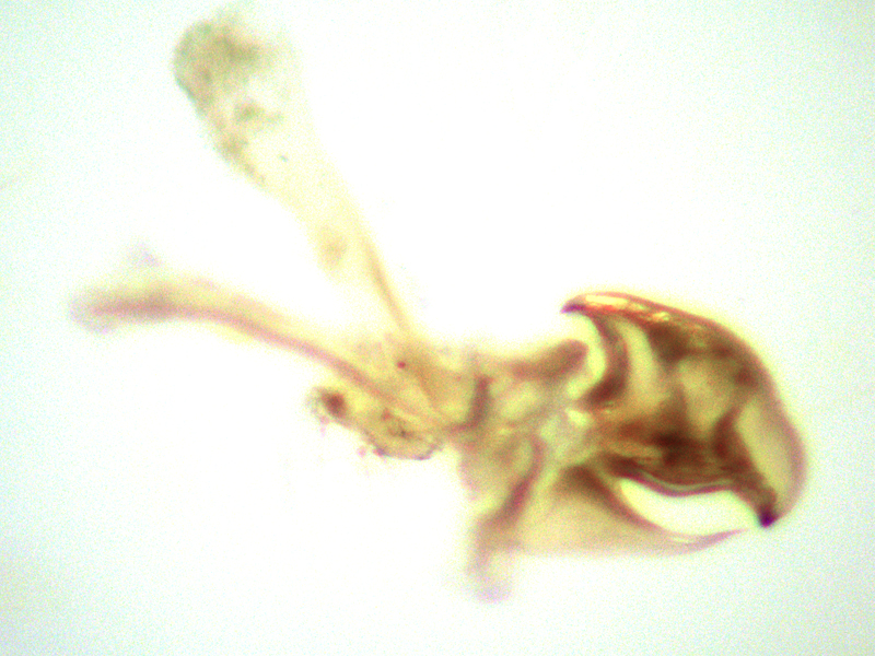 I initially thought the following lacewing was a Chrysoperla carnea agg. as vein RMCV was well past the apex of cell IMC on the forewing I initially checked. But, as I always do with carnea agg., I checked the abdomen to rule out pallida, and to my surprise it did not resemble any Chrysoperla abdomen I have seen before, with a long triangularly-pointed chin and no lip. The lacewing was a little dried by now so I cleared the abdomen to make sure, and yes, I was right - and the internal apparatus didn't match carnea either (I had one handy to compare it with). The wing-venation and other characters didn't fit Peyerimhoffina gracilis, so at this point - I should have done this earlier - I checked the other wing. The other wing didn't have a cell IMC at all. I looked back at the first wing and I think cell IMC is smaller than usual, which would bring its apex forward in relation to vein RMCV - this insect clearly had abnormal wing venation. Other characters checked out for Cunctochrysa albolineata, so I presume that's what it is. I've never needed to check the internal aparatus of albolineata before and had to wait to the following season before I caught another one to compare it to, but it did indeed look the same (although I don't know how similar other closely related species like cosmia are in this respect).