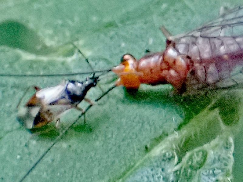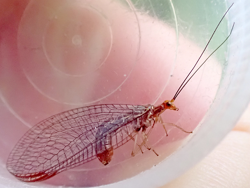 This one was found during the day, fairly early in the day, in woodland. It appeared to be moribund but it did perk up a little bit when I potted it for closer examination. Before I did so there was a flower bug, Anthocoris nemorum, positioned just in front of its head with its rostrum pointing to the lacewing's head. I could not tell for 100% certain but I think it is highly probable that the bug was feeding on the juices of the lacewing - these bugs are known to feed on the juices of insects and I've even had one land on my own hand, pierce my skin and feed on my juices (not for long - I quickly encouraged it to find something else to feed on!).