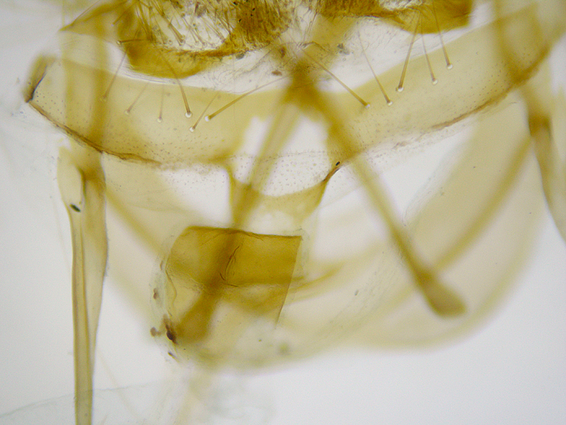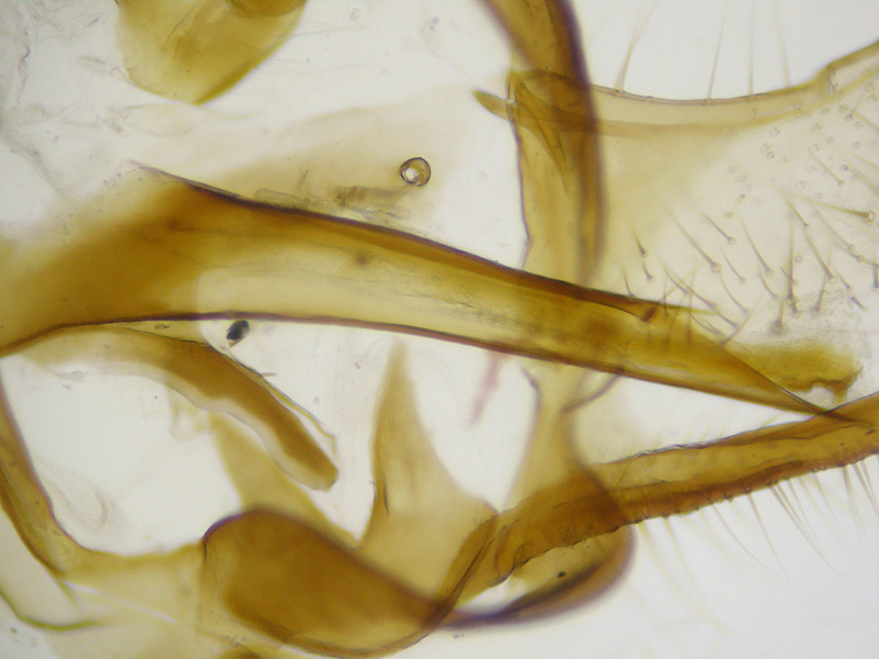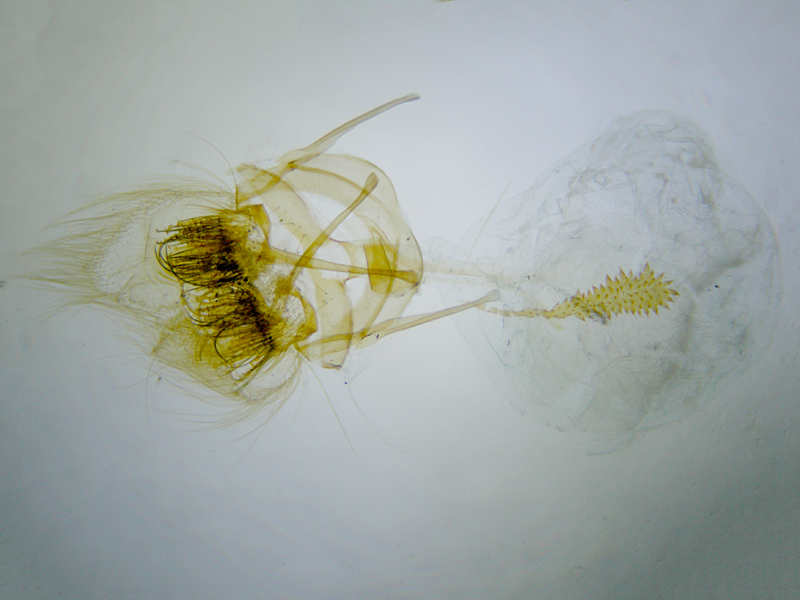 I'm yet to catch one in Norfolk but these three were caught together in Surrey (VC17) while I was visiting friends. The comparison images at the Moth Dissection website point to the long bulbous colliculum. I dont know if this is normally the case, but on this individual the colliculum was strongly bent into an S shape (best seen in side view) which meant that from the top it was not as long as it would be if this were straightened out (although even so it is still quite different from stephensiana). The sterigma shape was more like that of asseclana (shallower than stephensiana) though less tapered at the sides and a rounder ostium.
