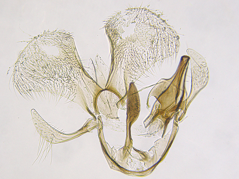 male Pellitory Beauty Cosmopterix pulchrimella showing genitalia, Reepham (Norfolk, UK), collected 12th August 2025