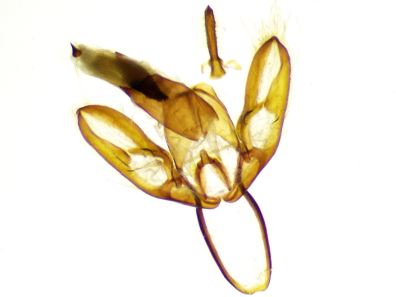 male Hoary Footman Eilema caniola showing forewing from side, hindwing and genitalia, North Elmham (Norfolk, UK), 19th August 2025