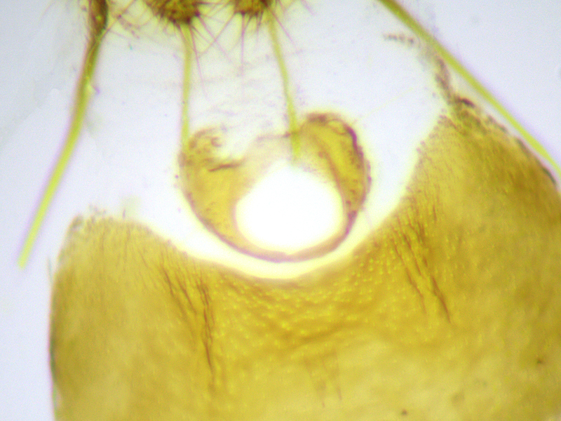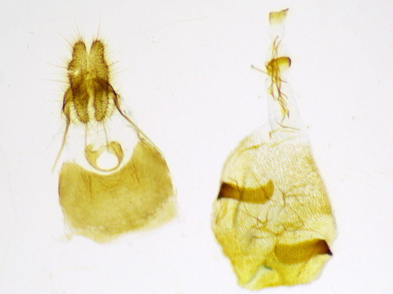 I was fairly confident about this moth's identification from its external appearance as I've not managed to find any other species that look similar. The shape of the pale dorsal blotch appears to rule out any similar forms of brunnichana. Examination of the genitalia seemed like a good idea to remove any doubt, although I'm not sure this really helped a hugh amount. Differences in female genitalia are rather slight, and some of the characters detailed in some sources do not appear to be consistent - for example that the signa on solandriana should be at the same level does not appear to be consistent . Clive Lewis at British Lepidoptera argues that this depends on the orientation of the corpus bursae, but as Chris says, this is not always easy to determine. I don't think honestly think I could confirm mine as solandriana on this character as at any orientation one signum is clearly higher than the other. The shape of the ostium is perhaps more useful, being wider and flatter-topped on soladriana compared to brunnichana. On mine the ductus bursae became detached from the ostium during preparation but I don't think this has significantly affected the overall shape of the ostium which seems a better match for solandriana than brunnichana.