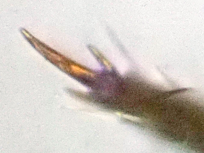 Lamyctes emarginatus after head (in side view, front to right), forcipular coxosternite, hind leg and hind tarsal claw (2 views), Wendling Beck Environment Project (Norfolk, UK), 25th to 26th August 2025