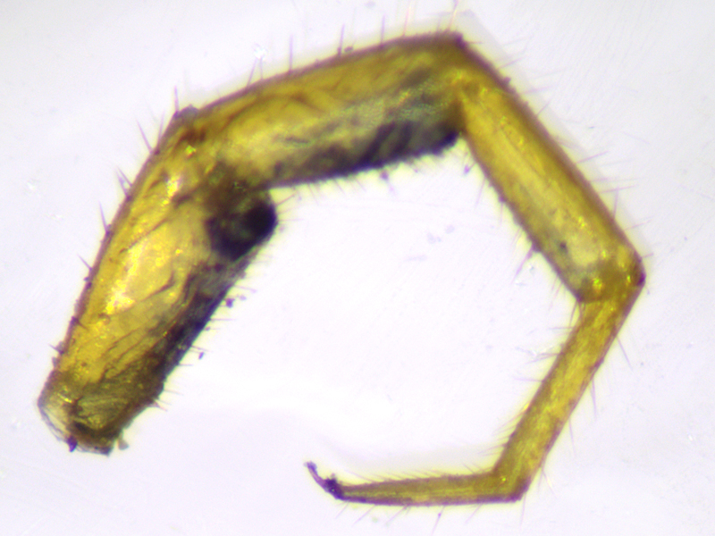 second Lamyctes emarginatus after head (in side view, front to right), forcipular coxosternite, hind leg and hind tarsal claw, Wendling Beck Environment Project (Norfolk, UK), 25th to 26th August 2025