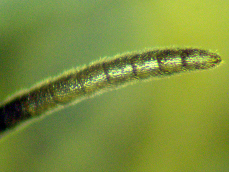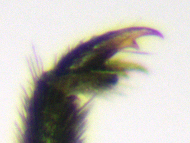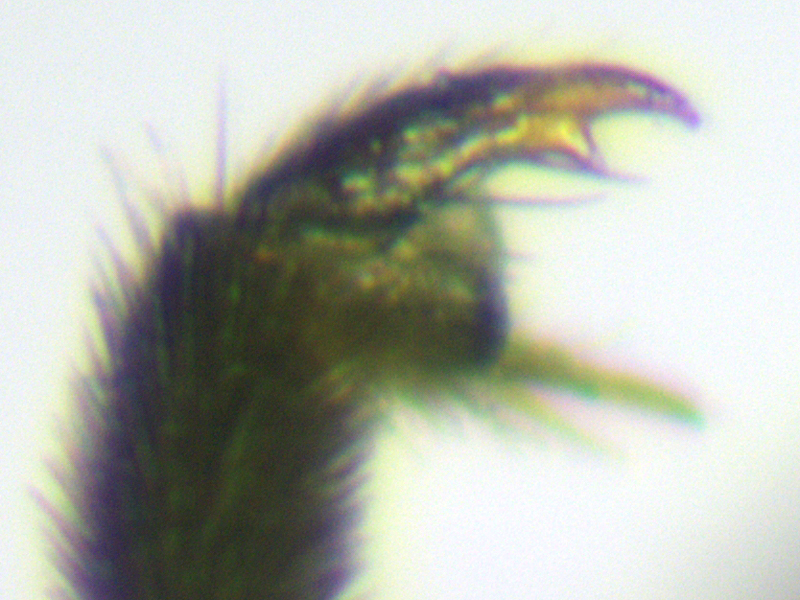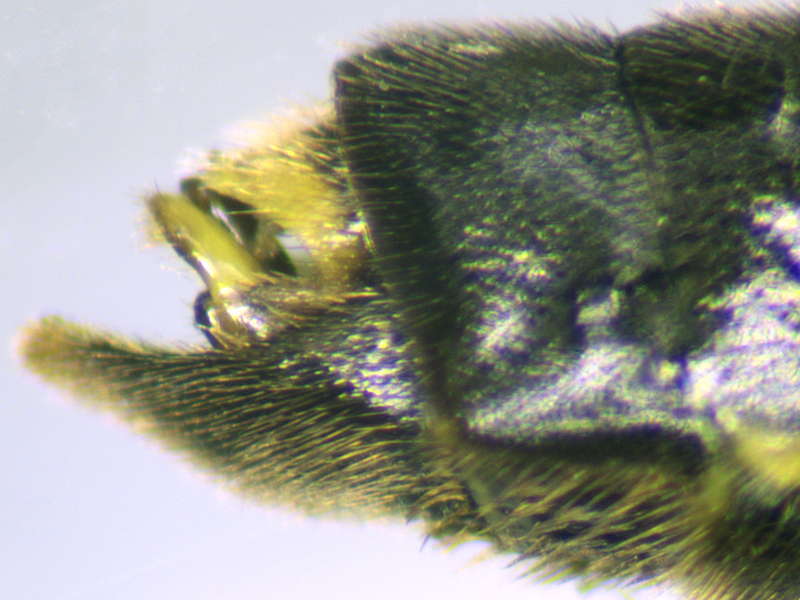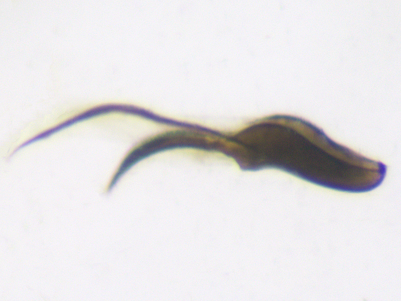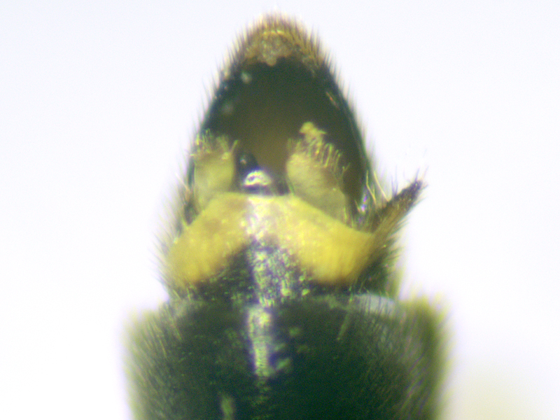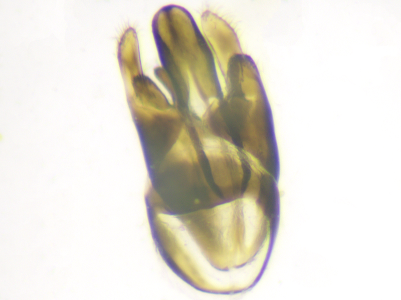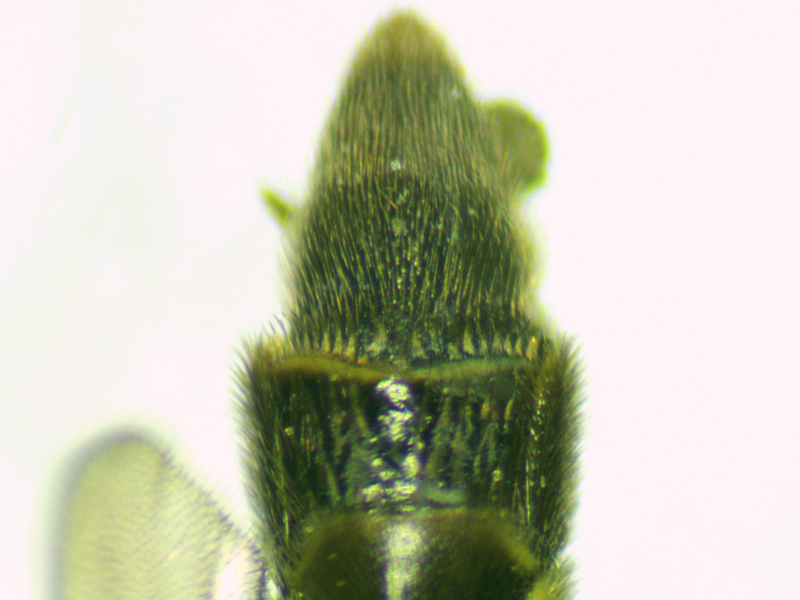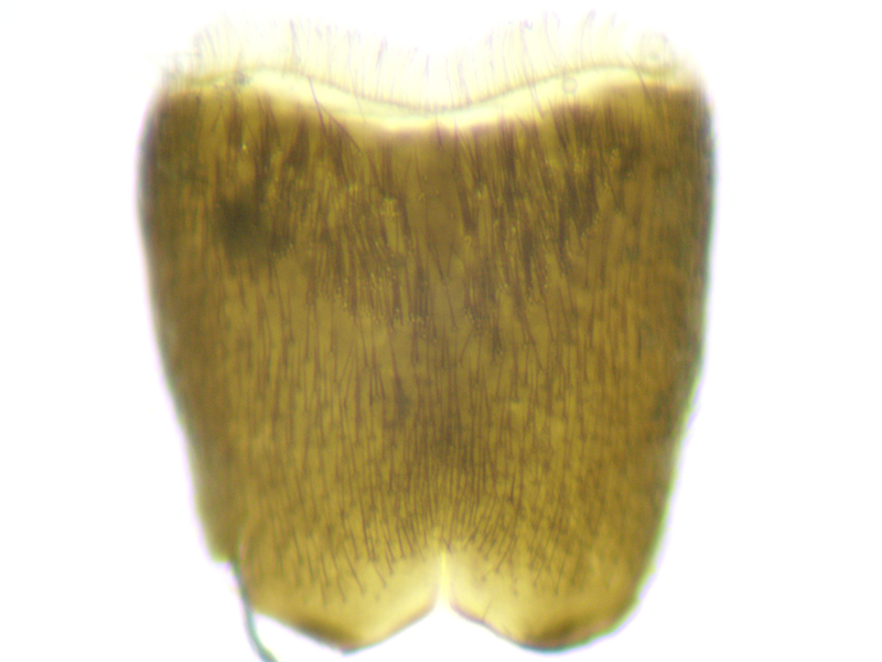 Wright's key to genera shows what looks like a fairly obvious triangular hair patch on the 8th sternite for Cephus, which I could not make out at all on the dry specimen. It also says there's an apical row of large flattened setae best as dark hairs in side view - I could see some large dark flattened setae but I wasn't sure these were forming an apical row. The width of the head as described in the RES key and Lacourt seemed to confirm that it was Cephus but again referred to detail on sternite 8 that I couldn't make out. In the end I resorted to clearing the abdomen in potassium hydroxide and once I'd done that and isolated sternite 8 I could make out the triangle of thick black hair scales. This seems to be a much harder character to see than is suggested in Wright. I don't think any of my references show the aedeagus for Cephidae so I don't know if there are significant differences between the species, but as I'd cleared it anyway I've shown photos below in case they might be relevant.