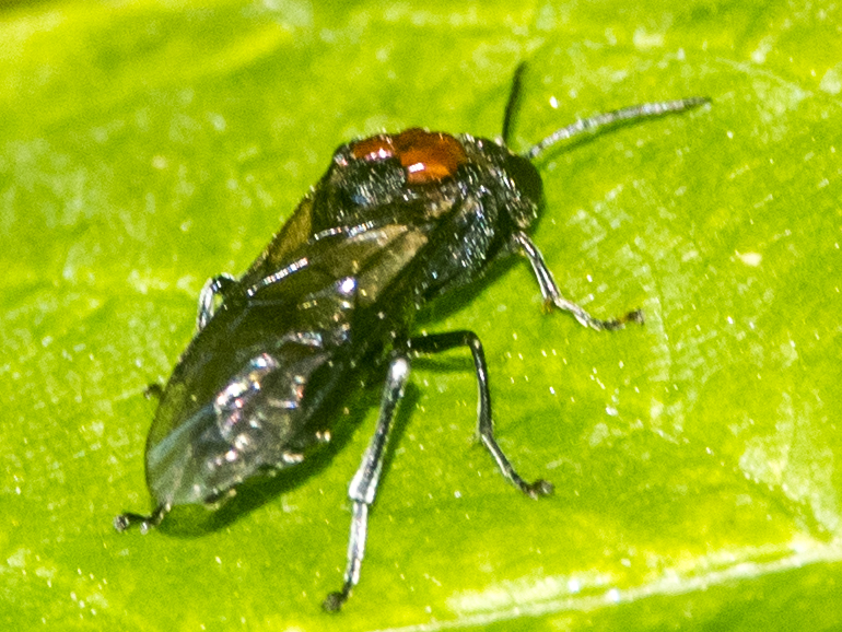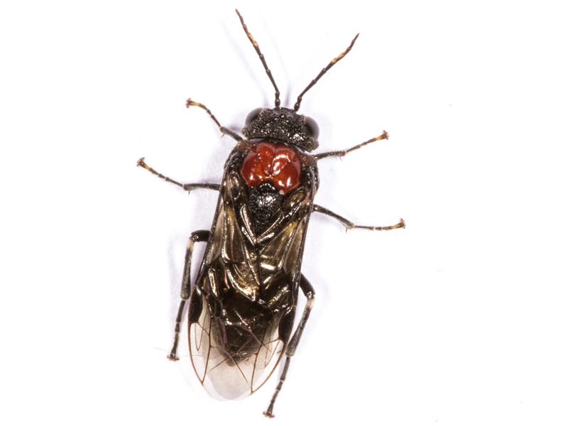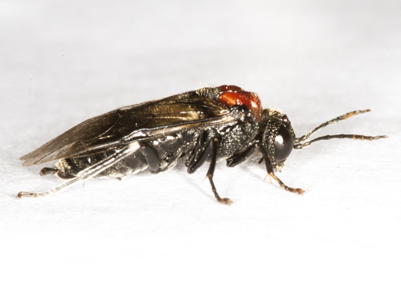 I found these fairly soon after finding my first couple of Eutomostethus ephippium, the similar sawfly that shares the overall appearance of red on the thorax and otherwise largely black body. That species has the red extending down the sides of the thorax, is much smaller (at least the specimen I compared was half the size) and has much less puncturing. Despite their similarity the two species are in different subfamilies.