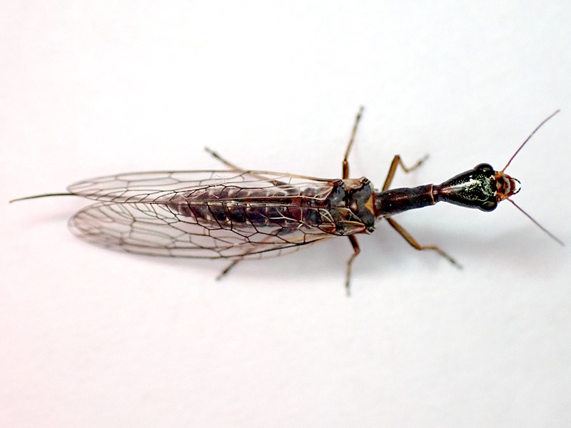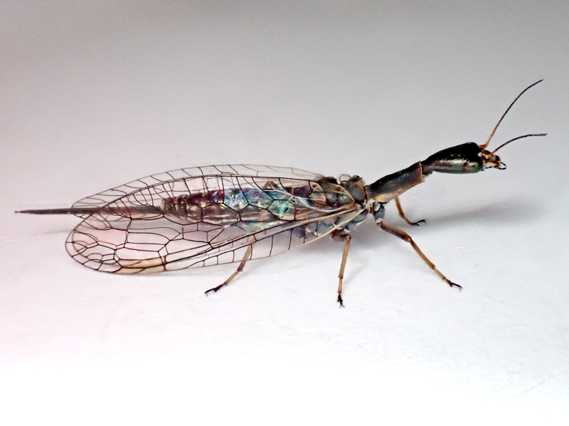 This one was swept from gound-level vegetation under trees at the edge of a woodland on a windy day. I was sweeping under a pine tree in the hope of finding Atlantoraphidia maculicollis - that wasn't to be this time, but any snakefly is always nice. This one was missing its forewing on its left side.
