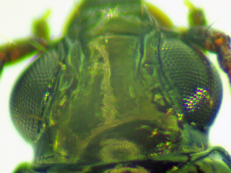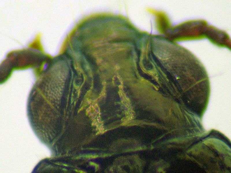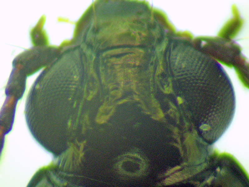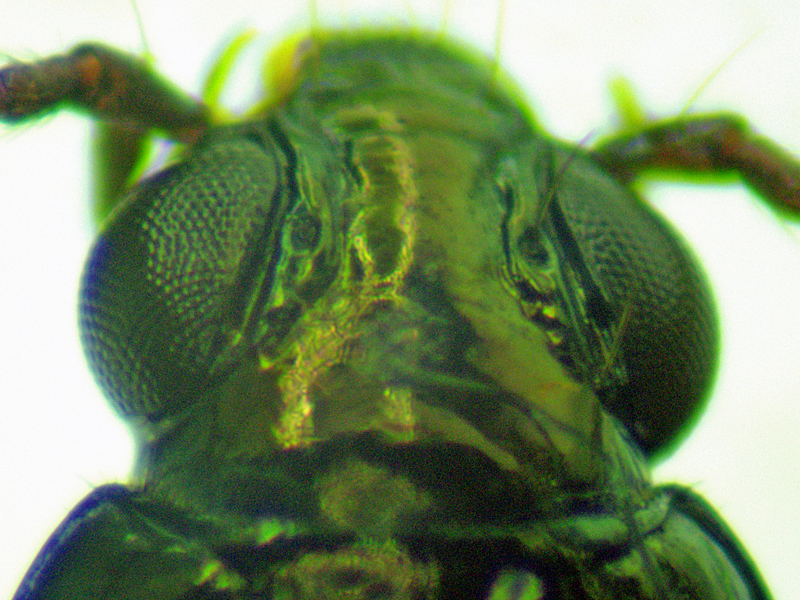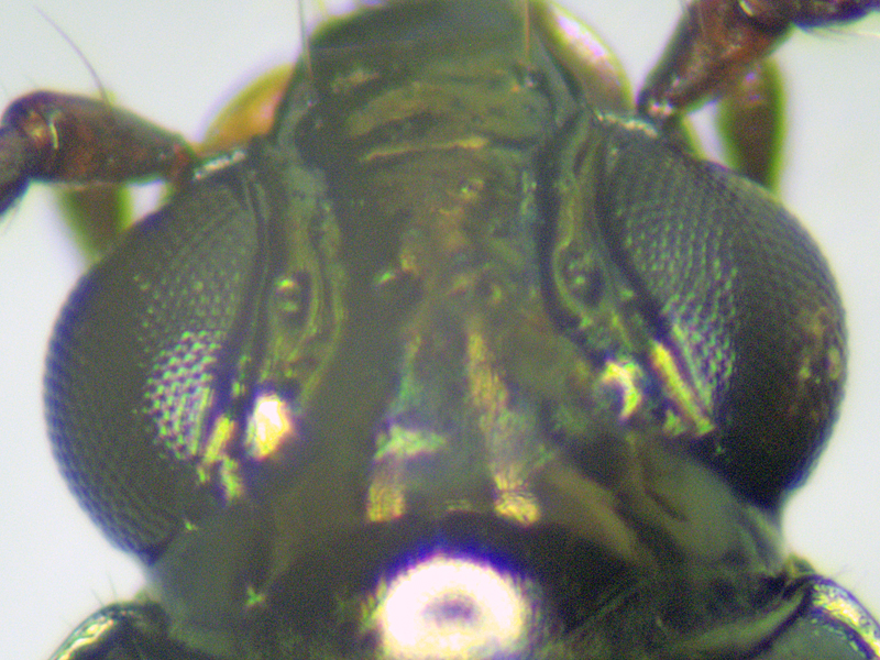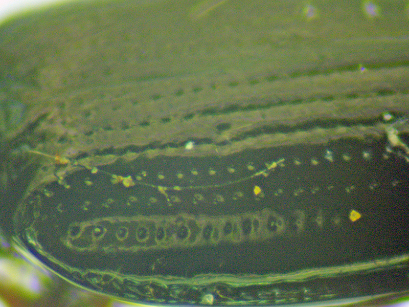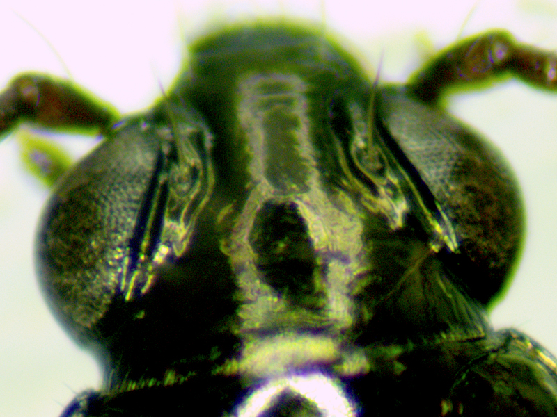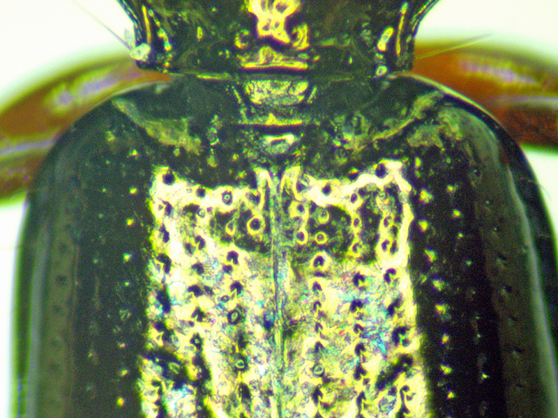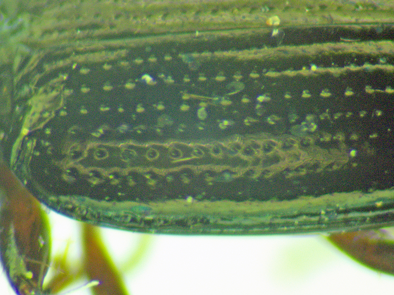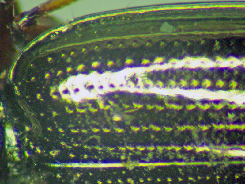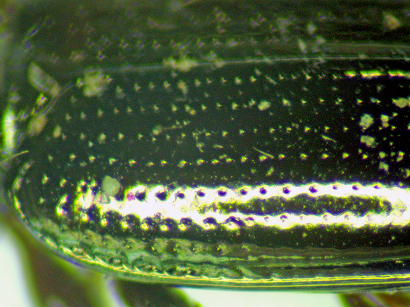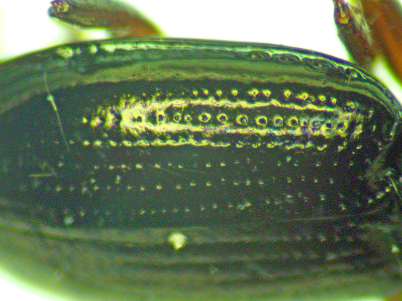 female Bembidion lampros showing frontal grooves, elytral striae on both sides and spermatheca, North Elmham (Norfolk, UK), 27th April 2023